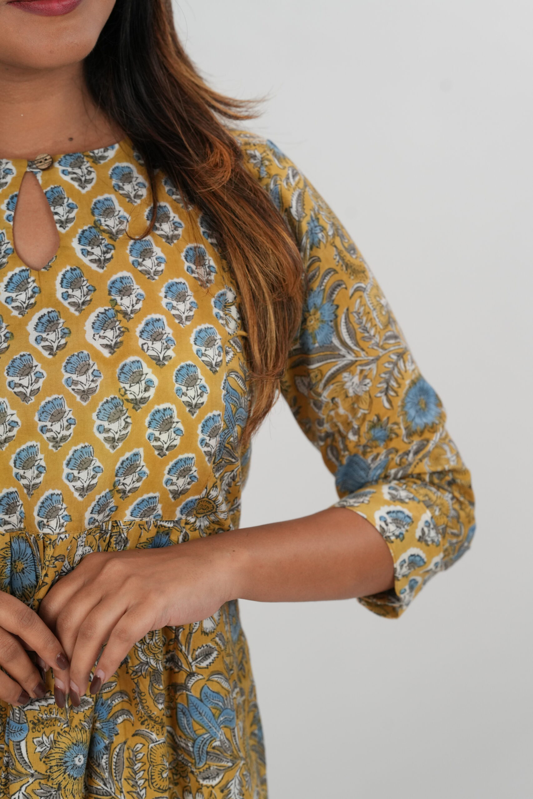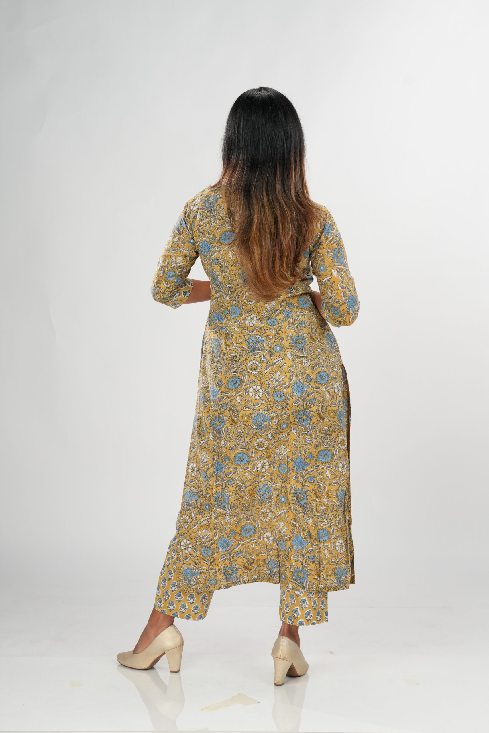 Embrace effortless elegance with our Aira Sanganeri Co-ord Set, handcrafted in soft and breathable Sanganeri cotton fabric. The beautiful mustard base adorned with intricate blue floral hand-block prints captures the essence of traditional Sanganeri artistry. Designed with a flattering silhouette, this set features a keyhole neckline, three-quarter sleeves, and coordinated pants for a chic and comfortable look.