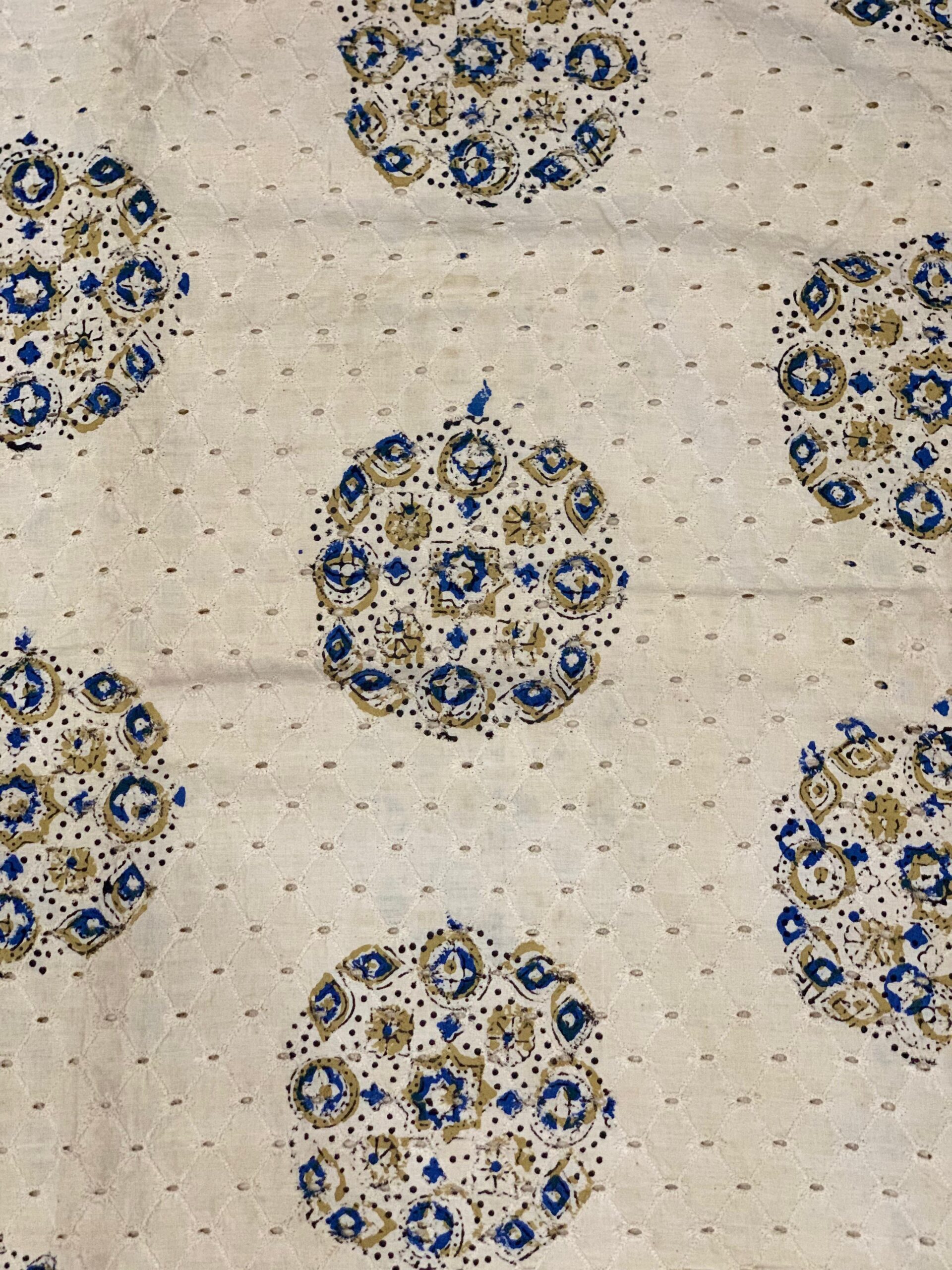 A unique blend of heritage and elegance, this fabric combines traditional Ajrakh block prints with delicate Hakoba embroidery. Crafted on breathable cotton, it is perfect for kurtis, blouses, dupattas, and fusion wear. Lightweight, comfortable, and artisan-made, each piece carries the charm of natural dyes and timeless craftsmanship.