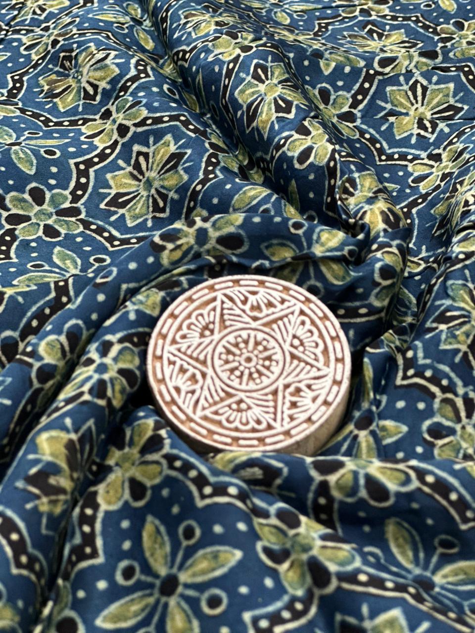 • Experience the richness of heritage with our Ajrakh Modal Running Fabrics, crafted using the age-old hand block printing technique of Ajrakh. Each piece reflects intricate patterns and deep, earthy tones created using traditional methods and skilled craftsmanship.