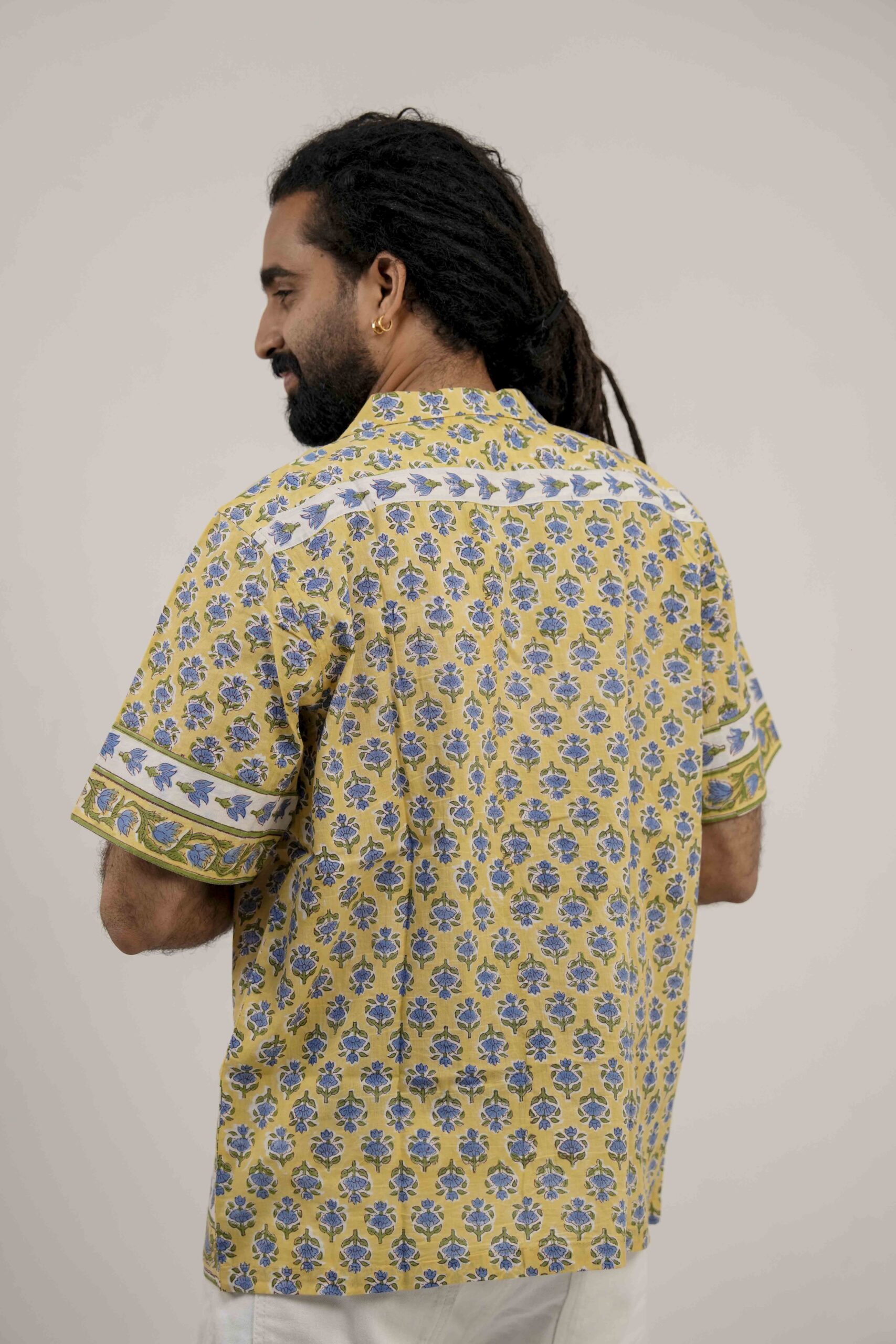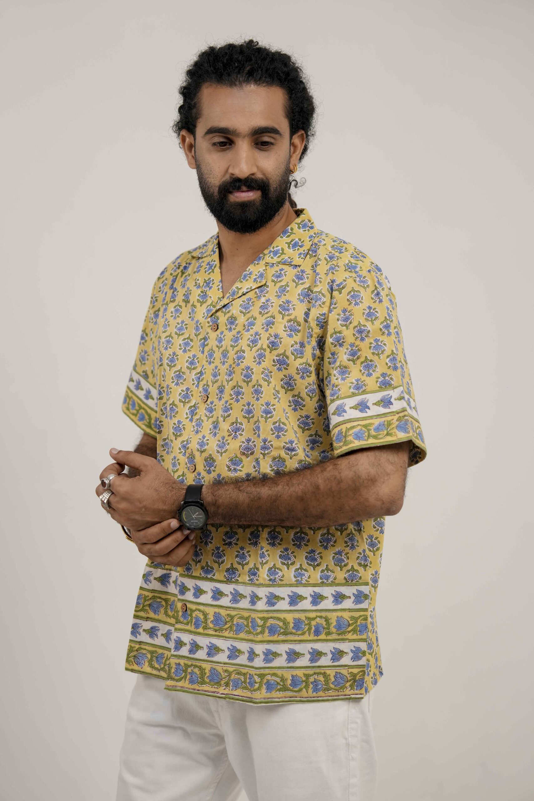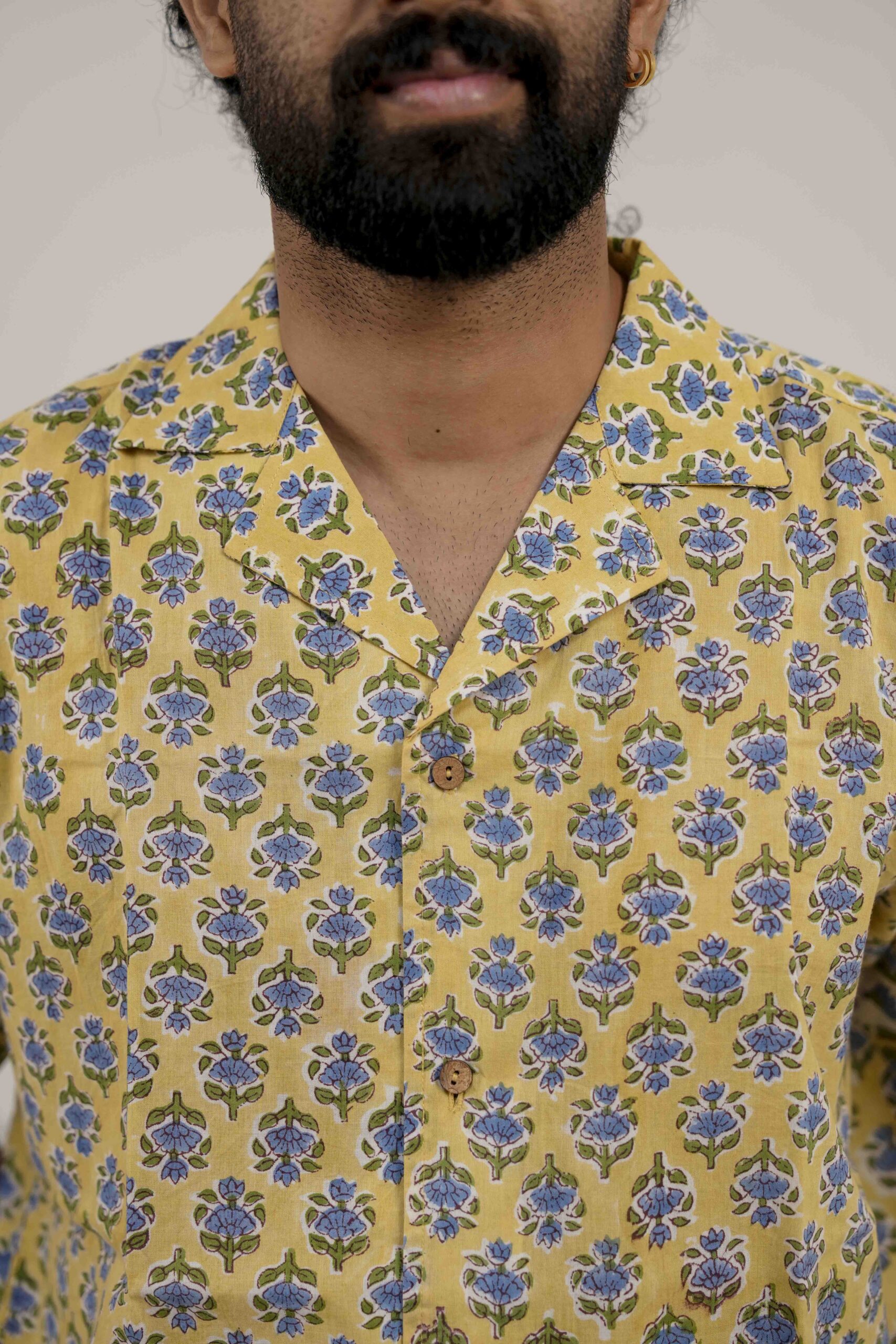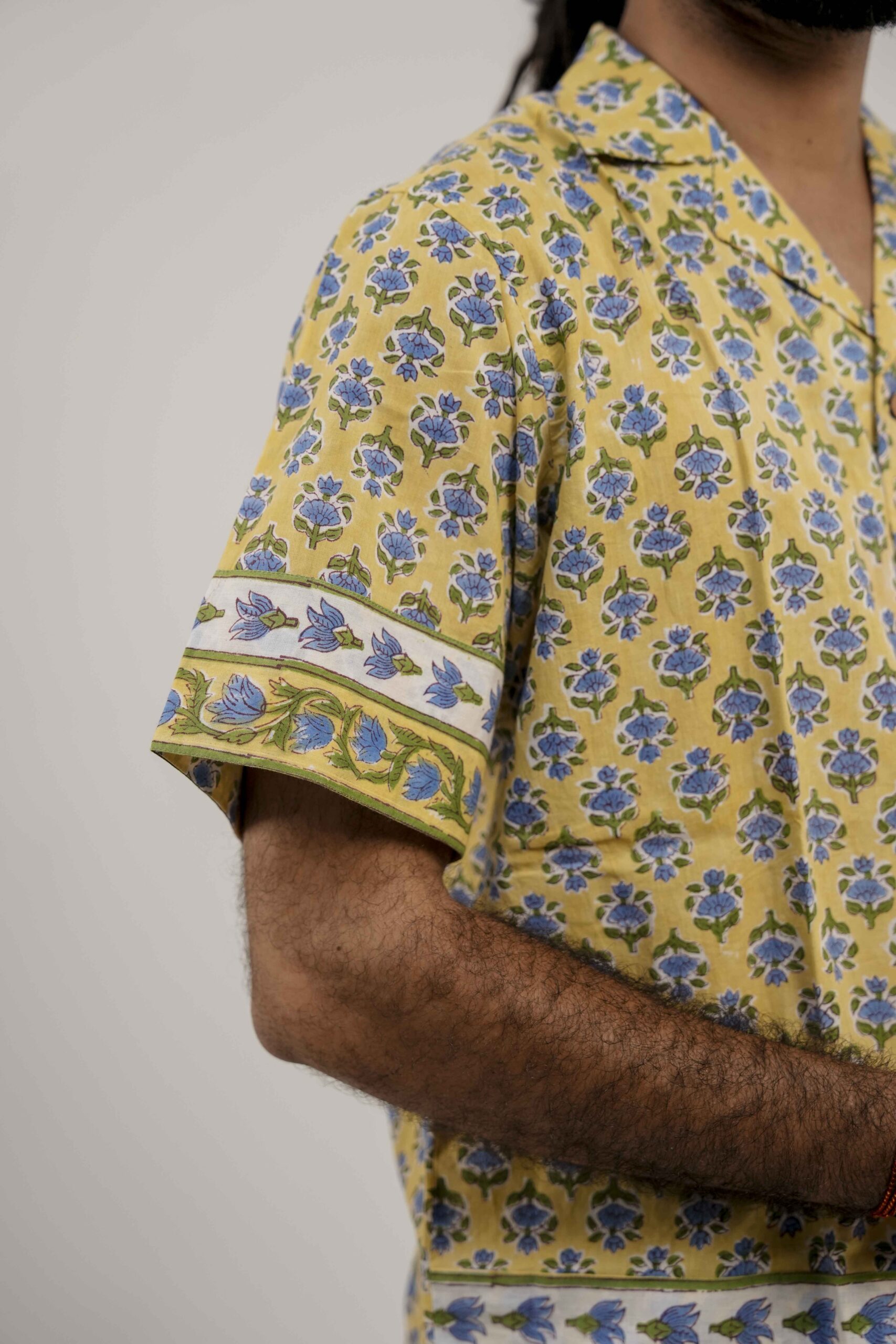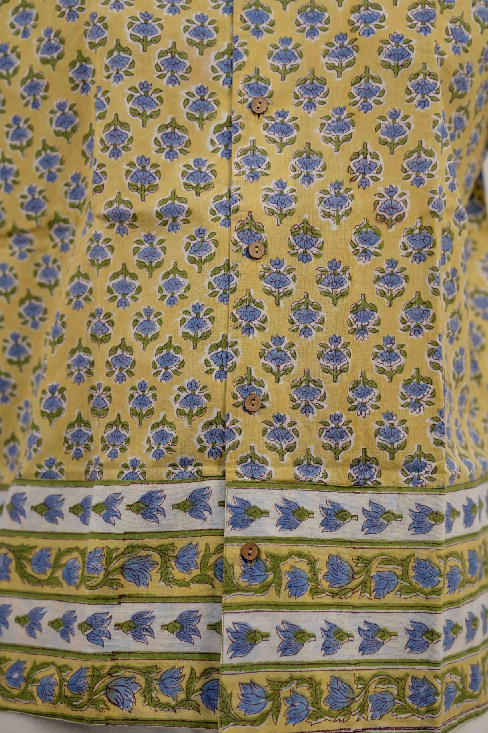 - Crafted in soft, breathable Sanganeri cotton, this shirt features delicate handblock floral motifs set against a refreshing yellow base. The design is elevated with distinctive contrast border detailing along the hem and sleeves, adding a refined and structured finish to the silhouette.