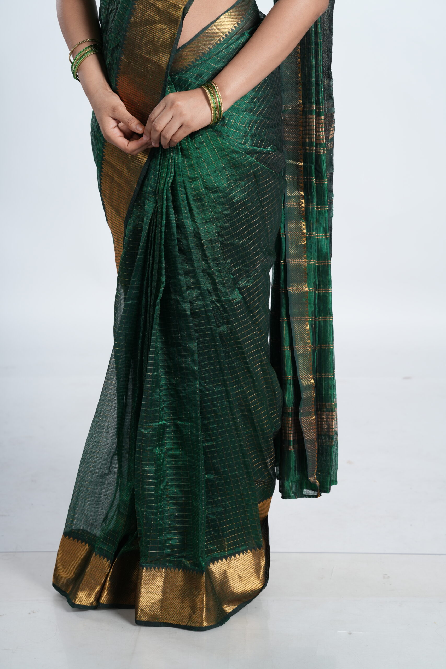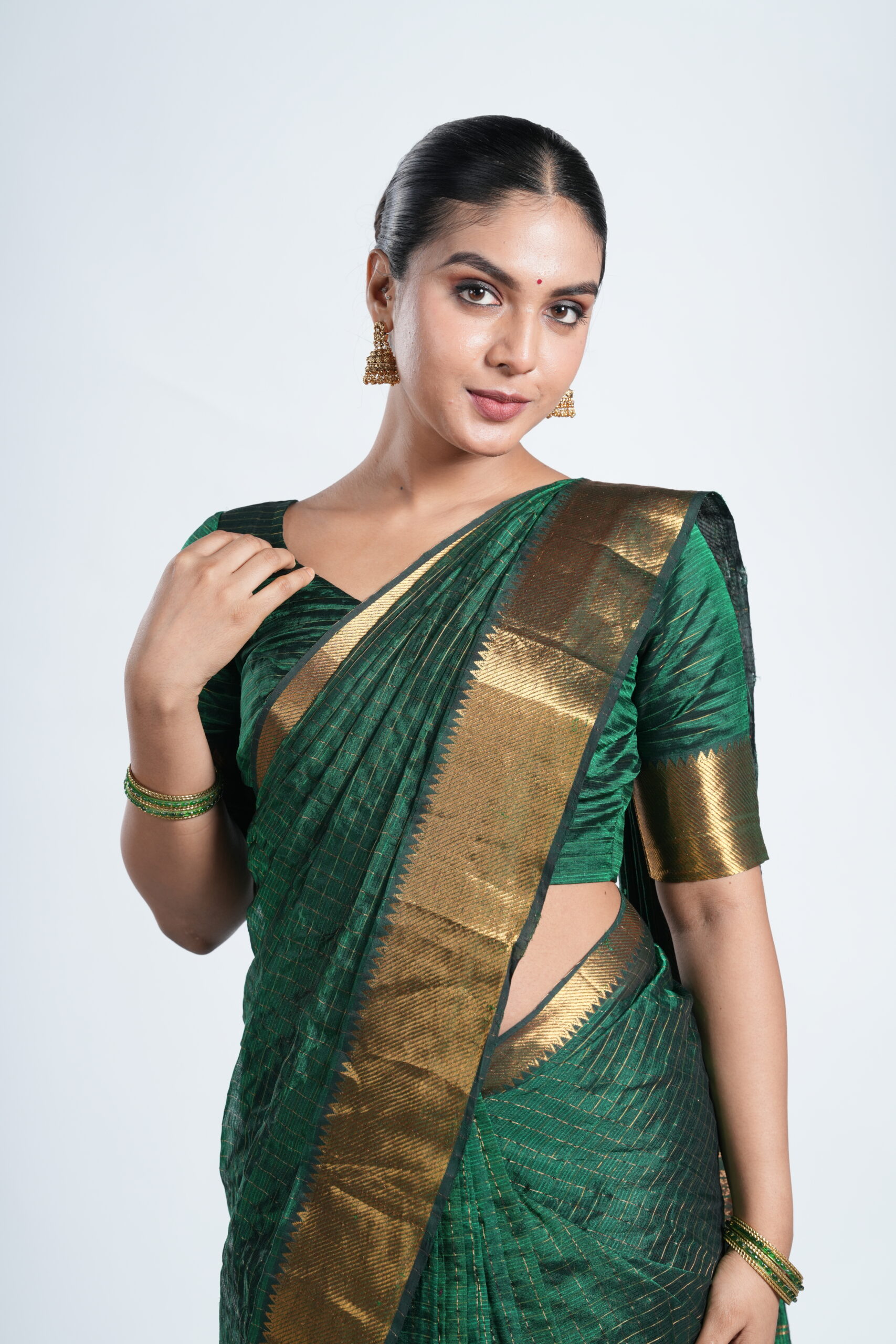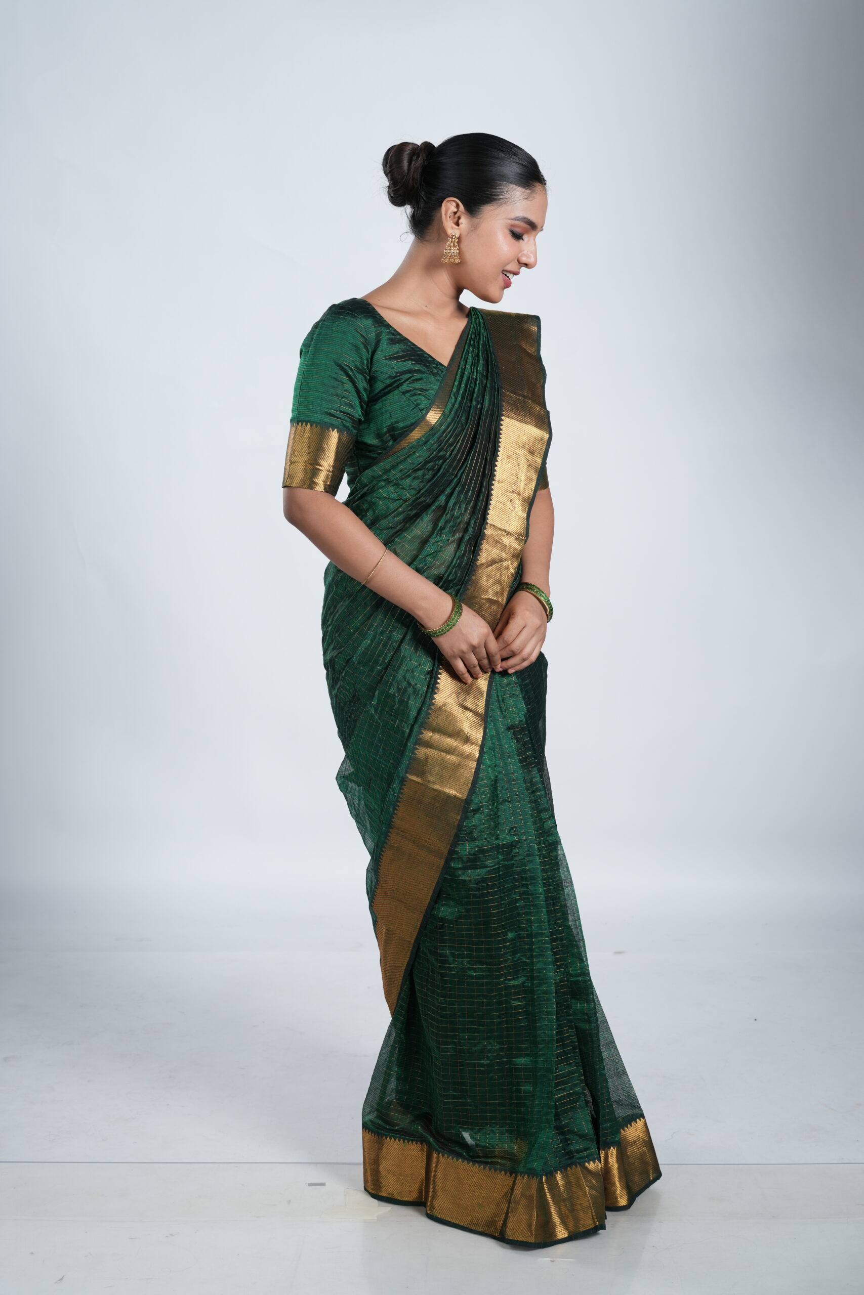 Embrace sophistication with the Deep Emerald Green Chequered Handwoven Mangalagiri Silk Saree. The timeless chequered design in Deep Emerald Green tones pairs beautifully with the luxurious silk fabric. Perfect for both casual and formal occasions, this saree offers a blend of tradition and modern elegance. Add this classic piece to your wardrobe for a refined look.