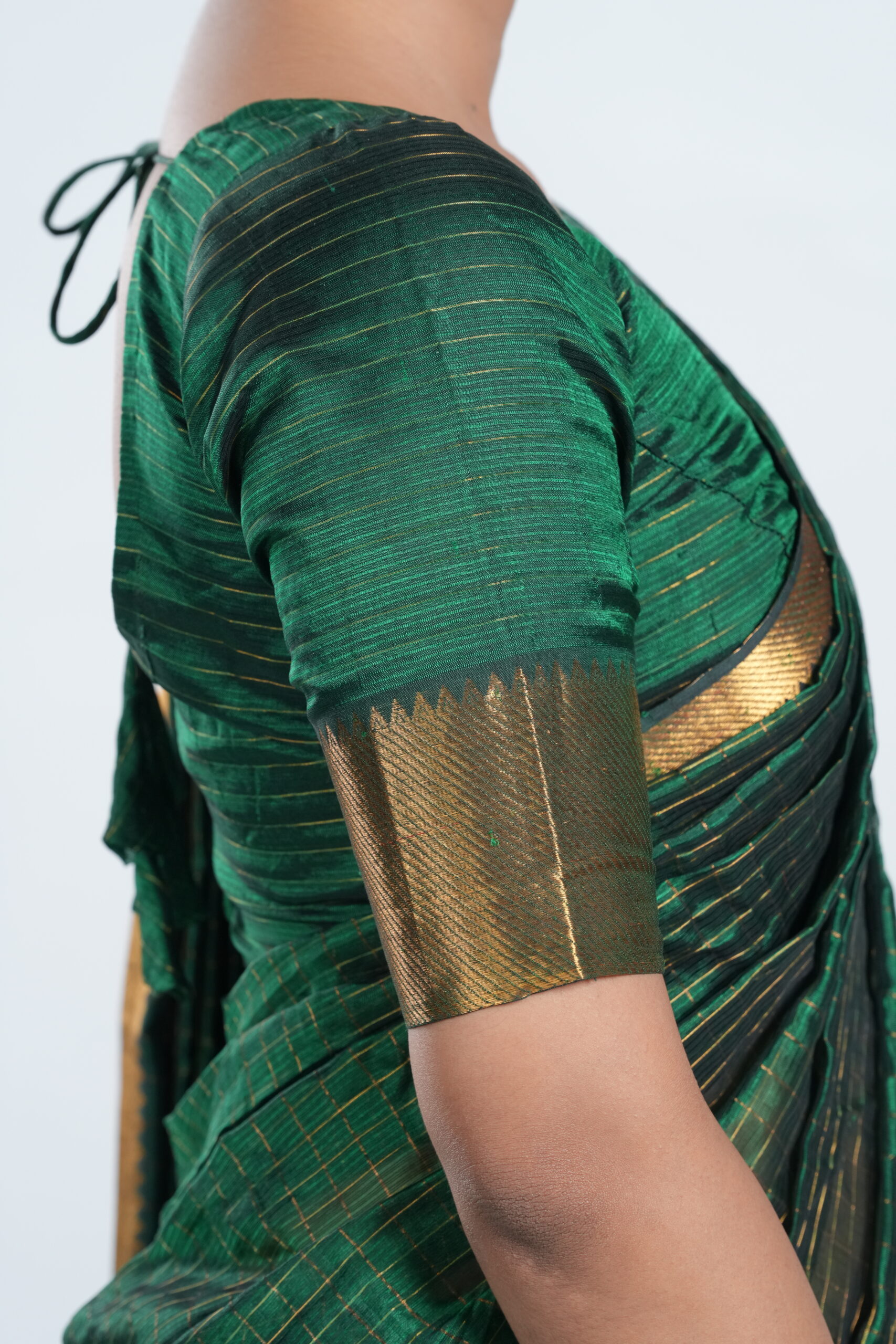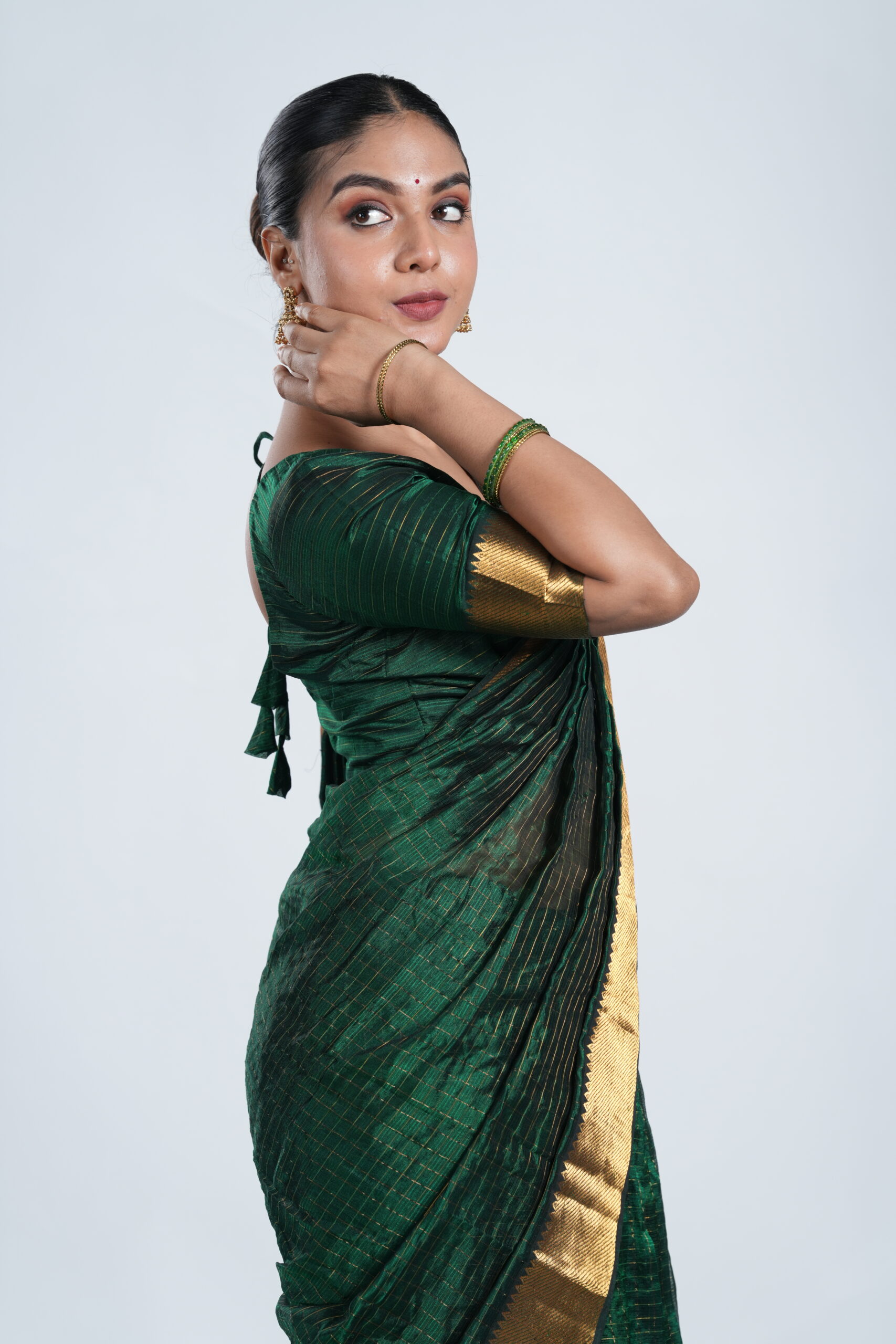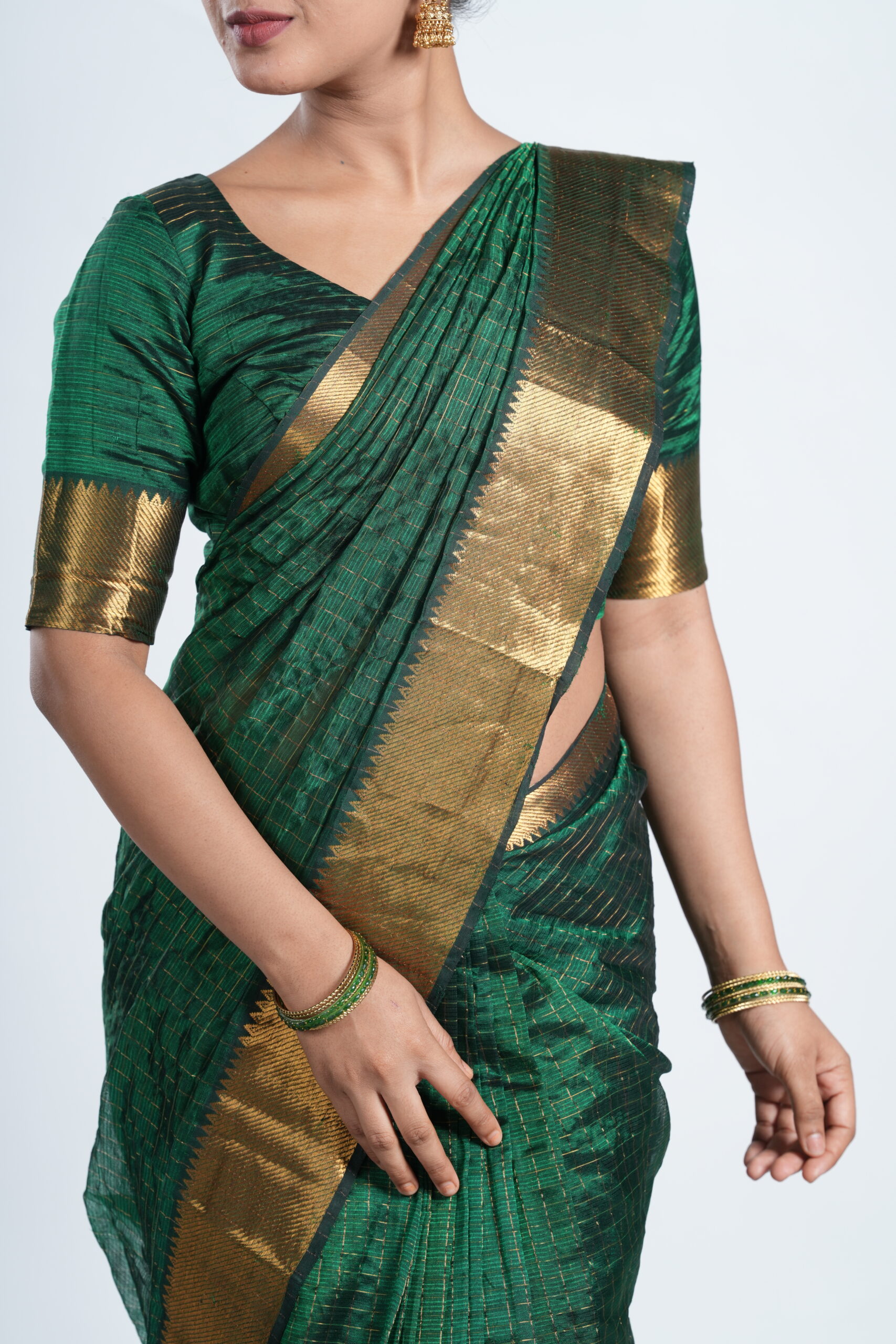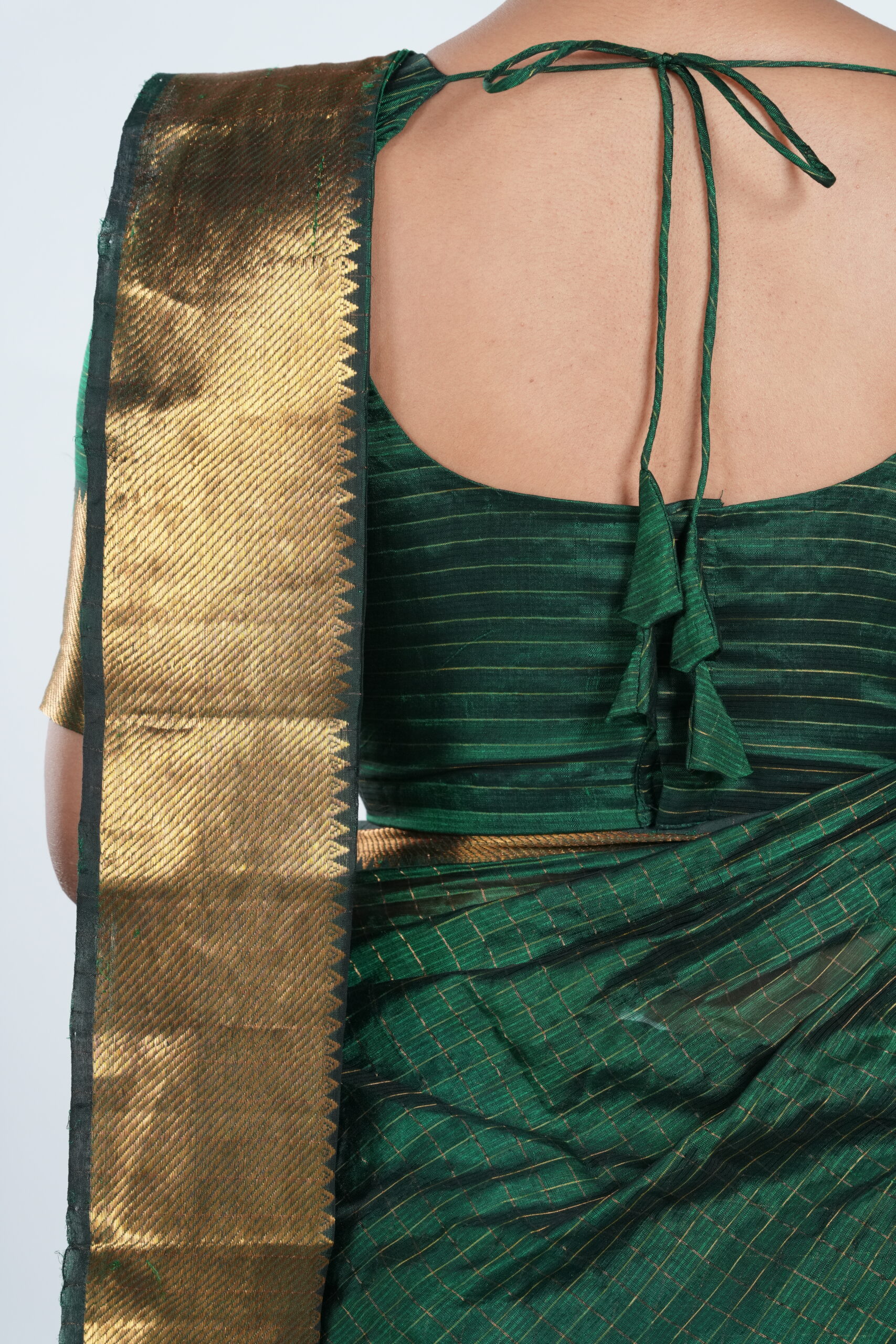 Embrace sophistication with the Deep Emerald Green Chequered Handwoven Mangalagiri Silk Saree. The timeless chequered design in Deep Emerald Green tones pairs beautifully with the luxurious silk fabric. Perfect for both casual and formal occasions, this saree offers a blend of tradition and modern elegance. Add this classic piece to your wardrobe for a refined look.