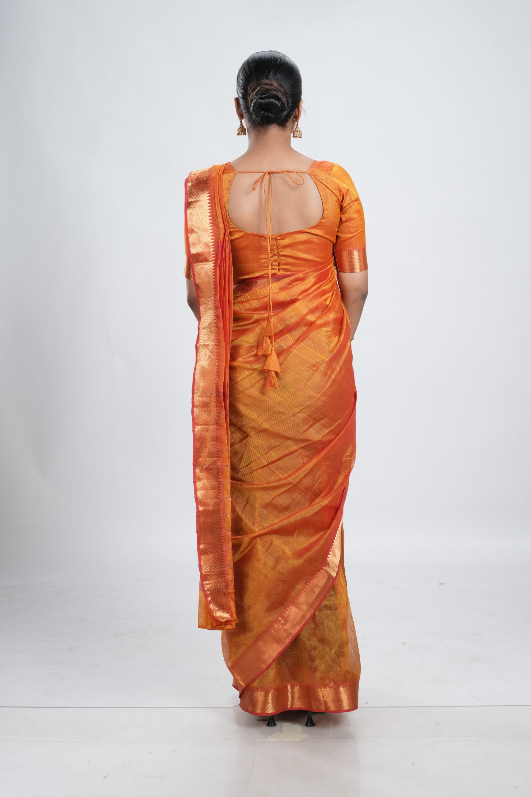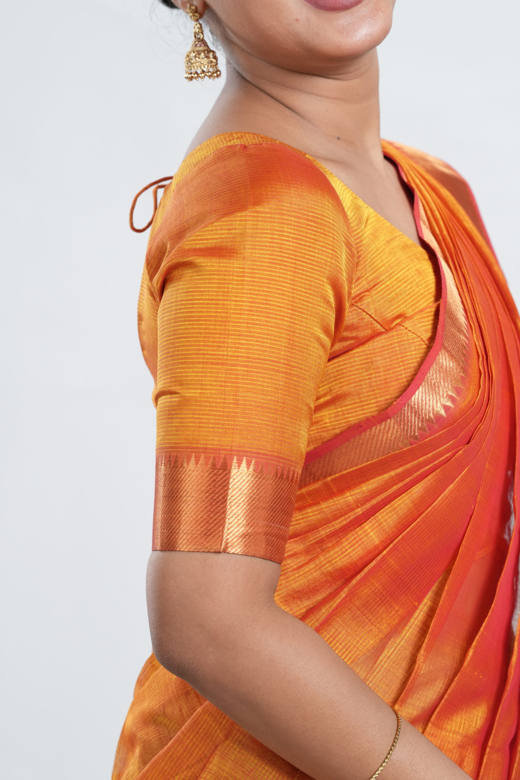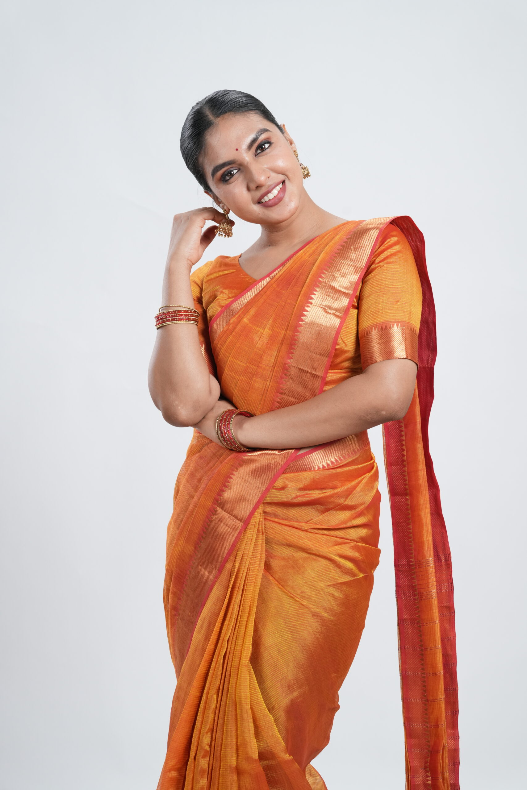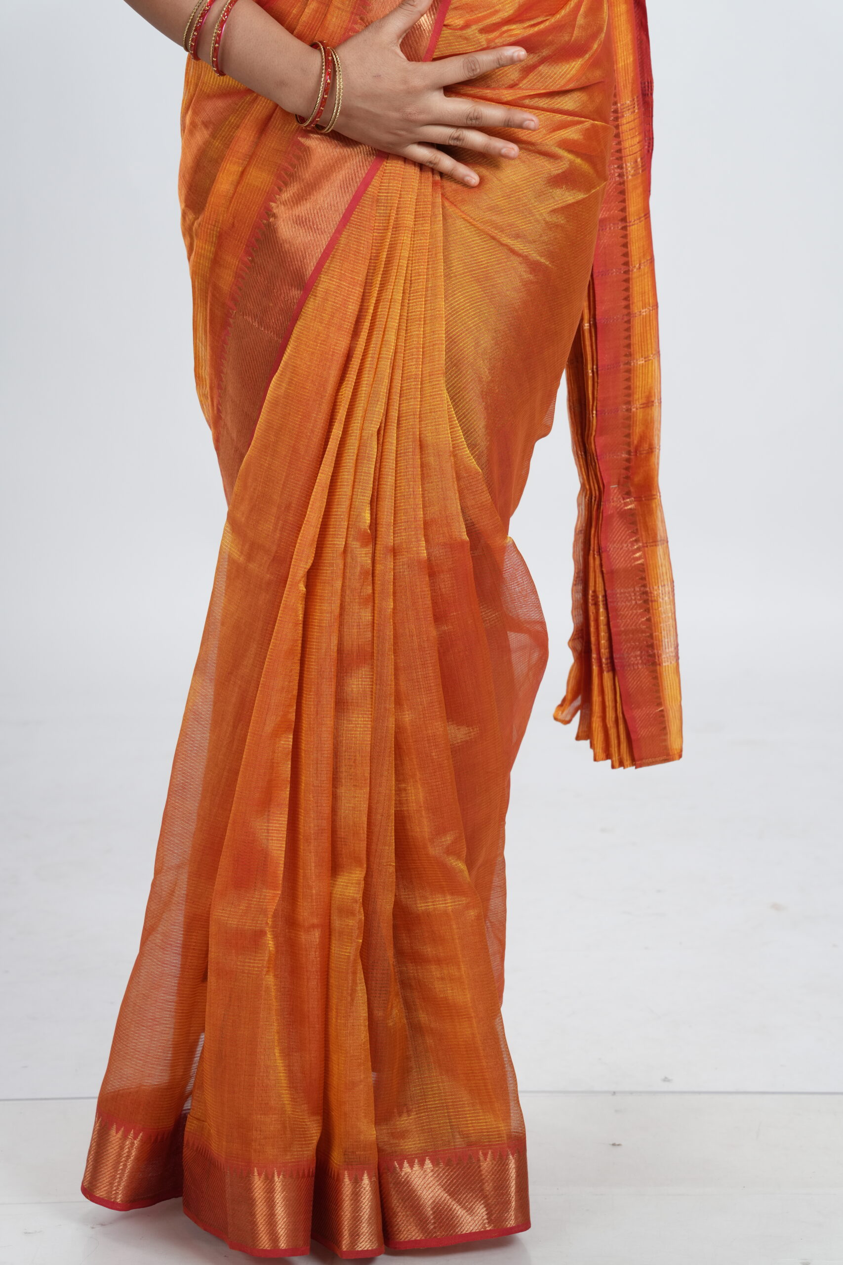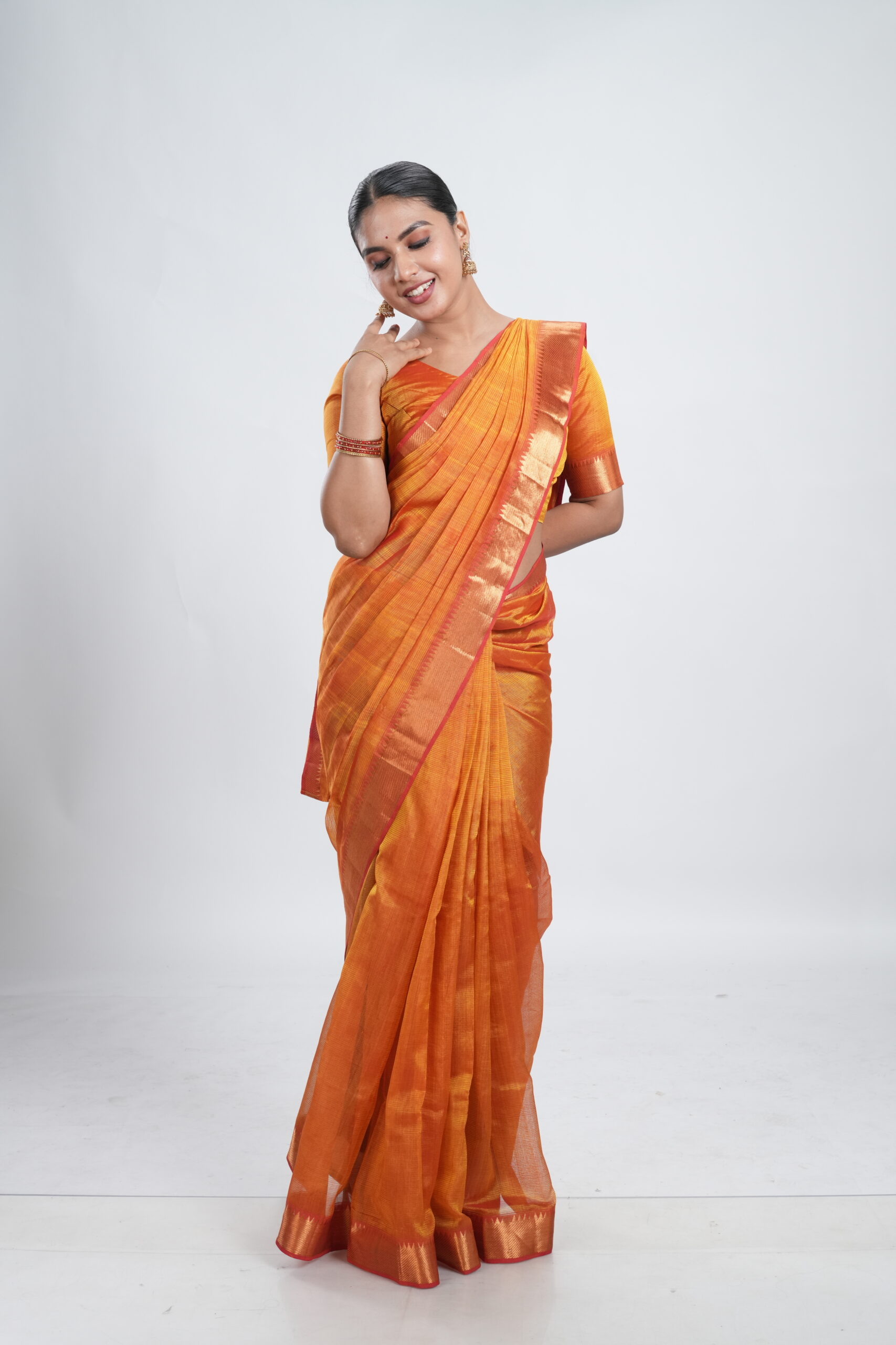 Grace meets tradition in this exquisites Mangalgiri Silk Saree, woven in a serene Golden Orange tone accentuated by a lustrous copper zari border. handwoven in the looms of Mangalgiri, the saree features the region’s signature fine weave with a subtle sheen, with the elegance of silk. The golden-copper zari border and pallu add a timeless touch makeing it perfect for festive wear, temple visit ,or elegant celebration.