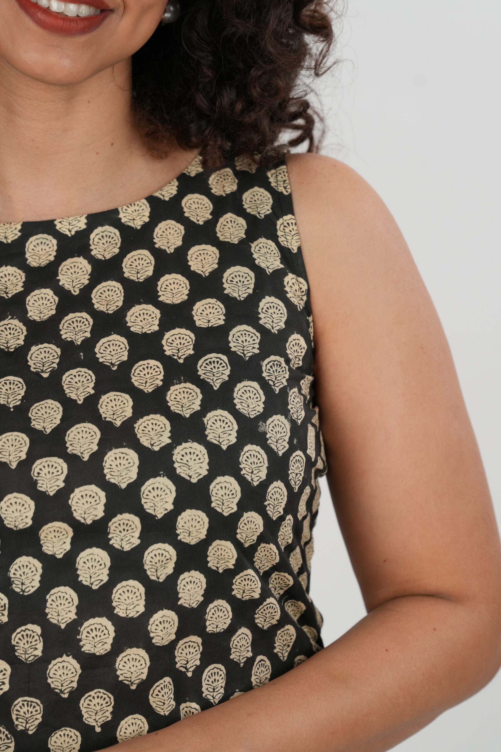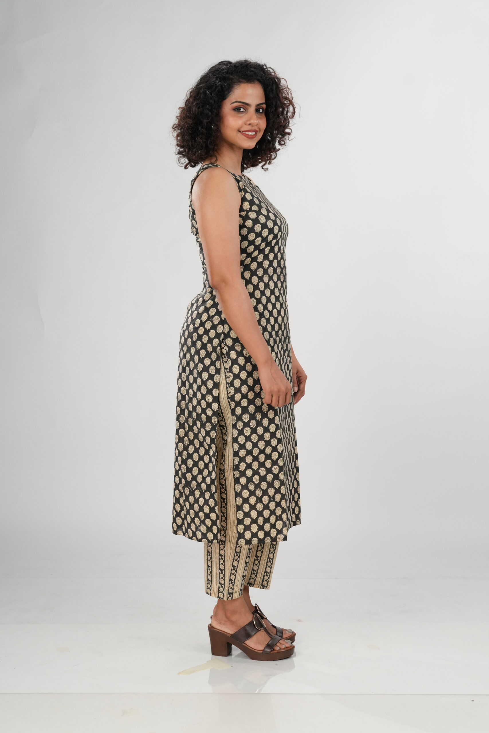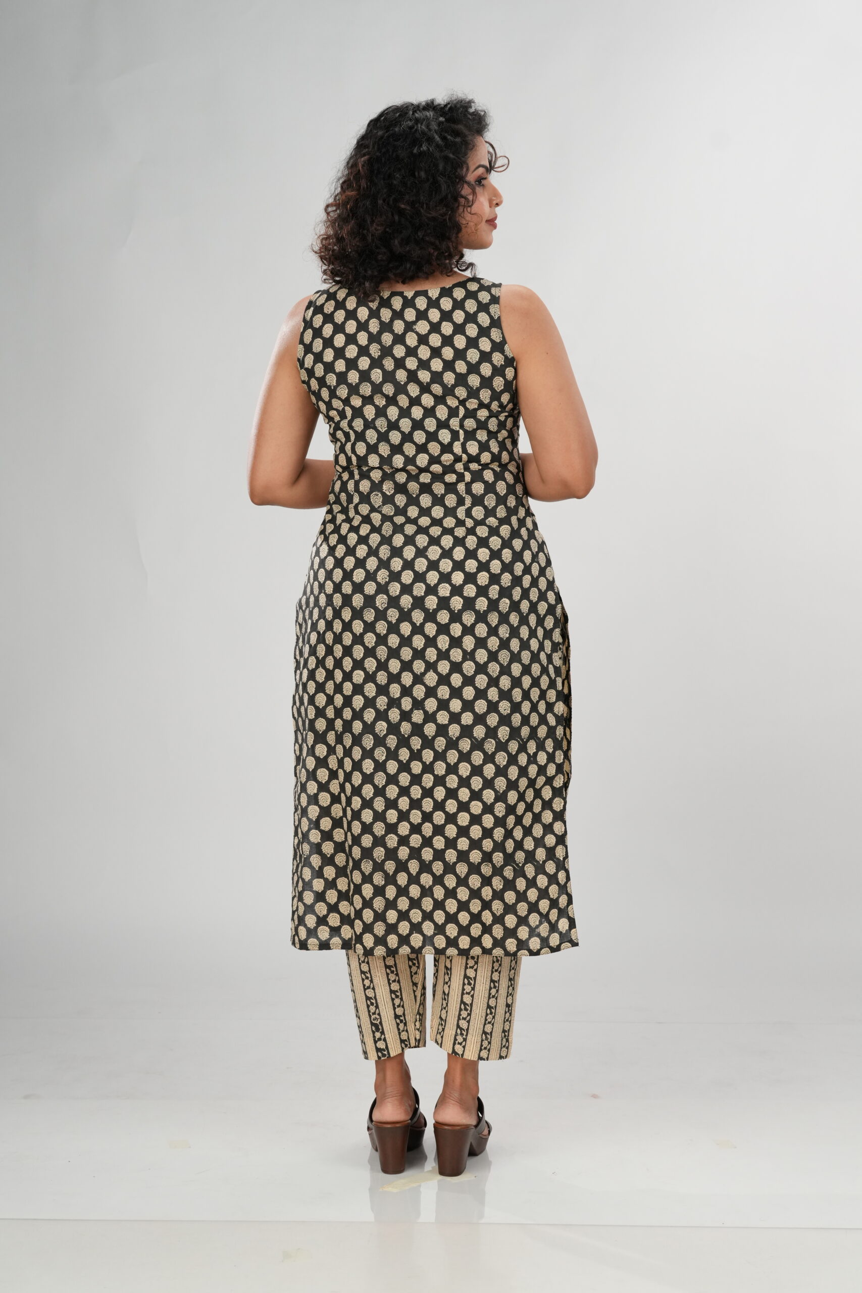 Elevate your everyday style with the Inaya Black Bagru Co-ord Set, a perfect blend of tradition and modern minimalism. Handcrafted in authentic Bagru-printed cotton, this set features a sleeveless straight kurta with a closed round neckline, adorned with intricate beige motifs on a rich black base. The contrasting striped printed pants add a touch of contemporary elegance, making it a versatile choice for both workwear and casual outings.