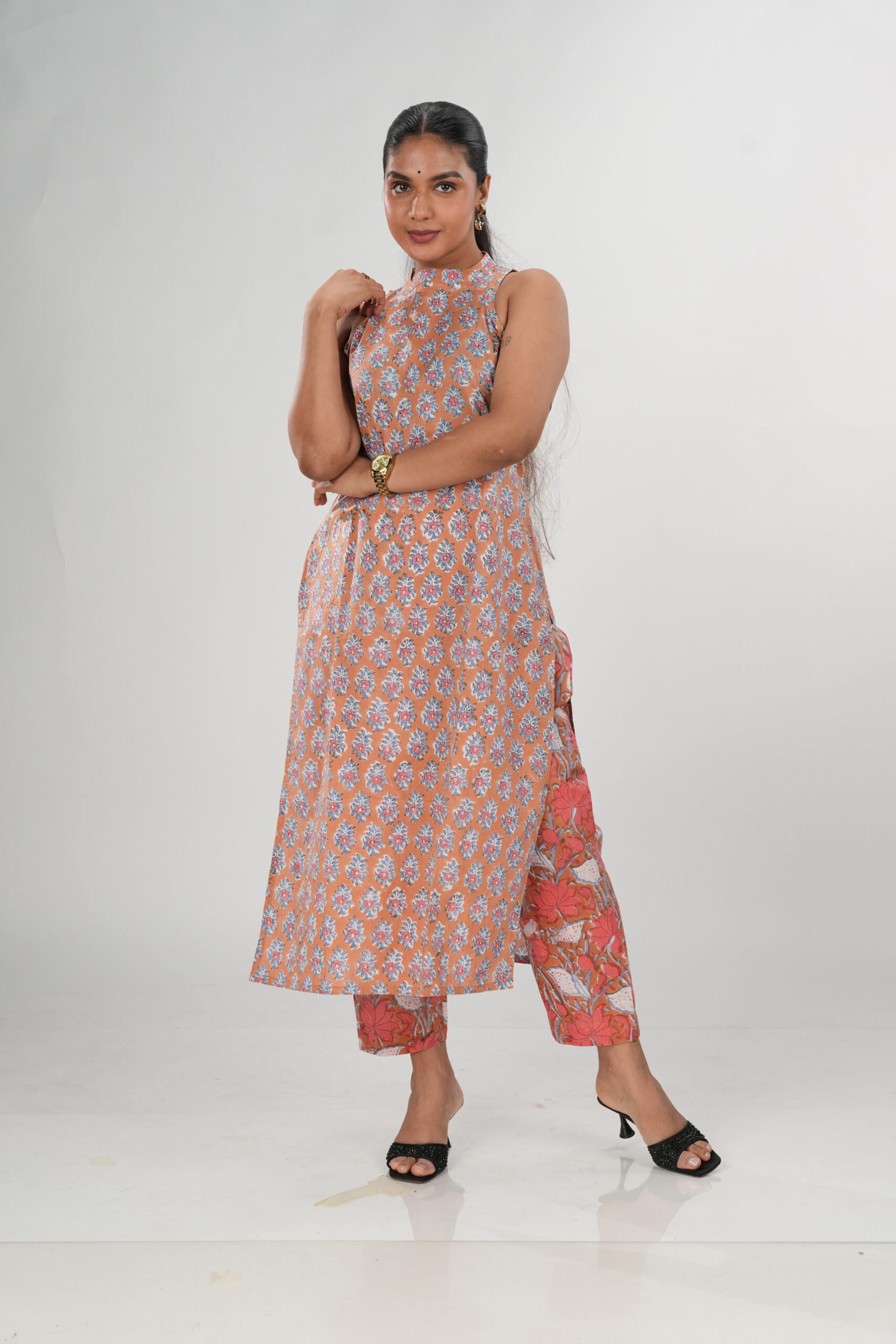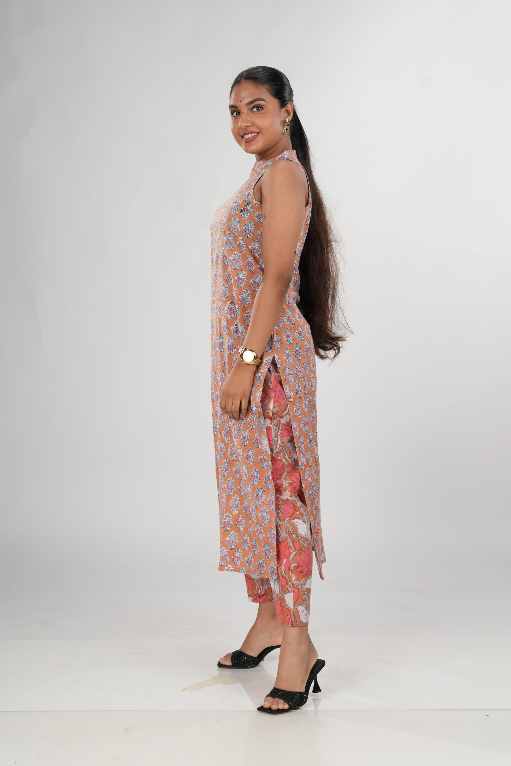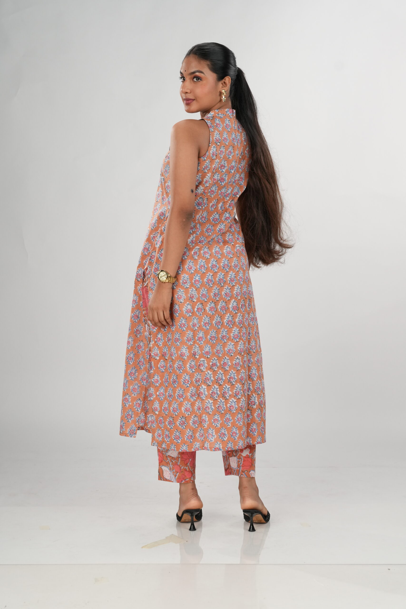 Crafted in cotton, this sleeveless coord features a high-neck halter style kurta adorned with delicate Sanganeri floral handblock prints in warm coral and blue tones. Paired with contrast pants, the ensemble exudes a confident, breezy elegance that transitions seamlessly from day to evening.