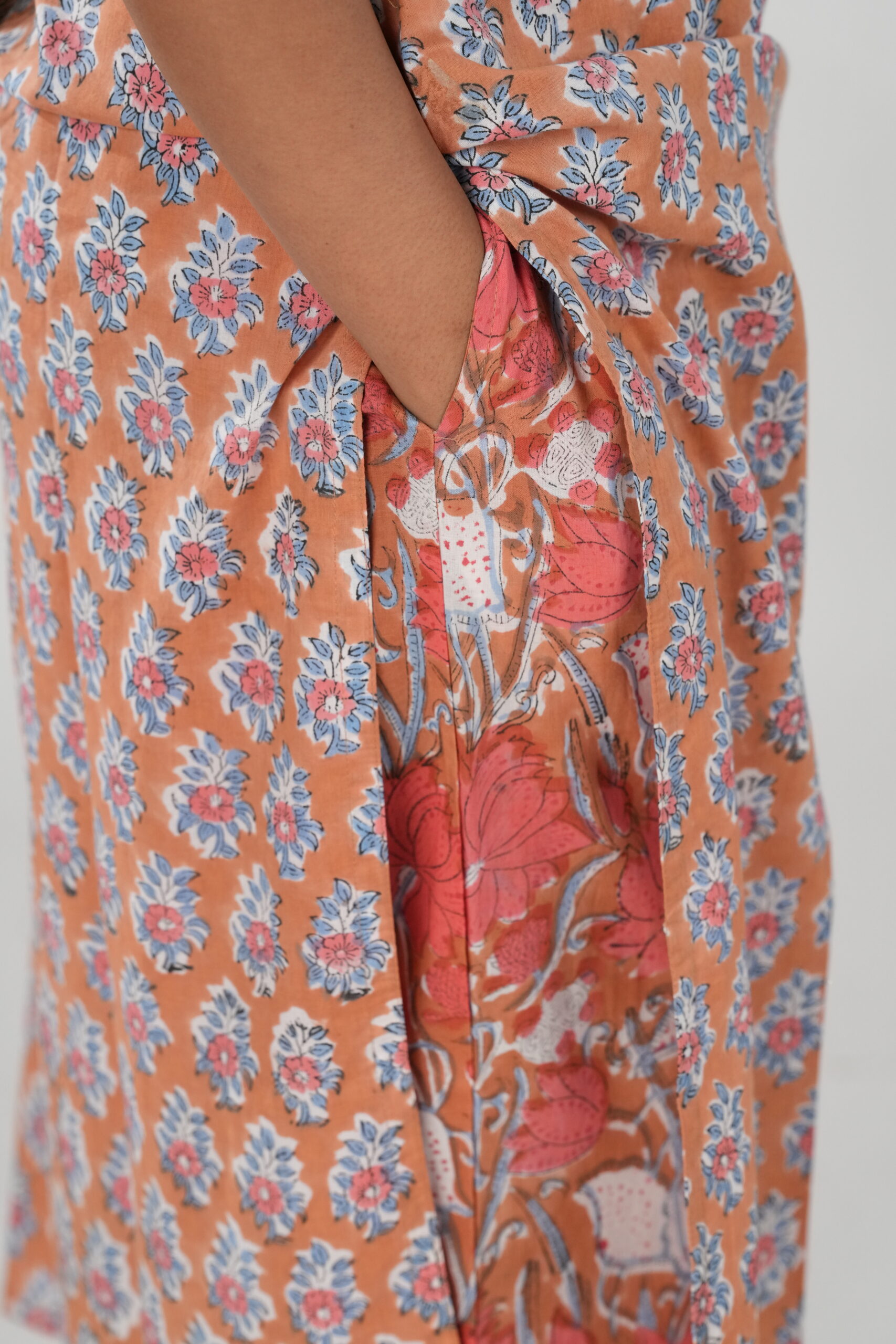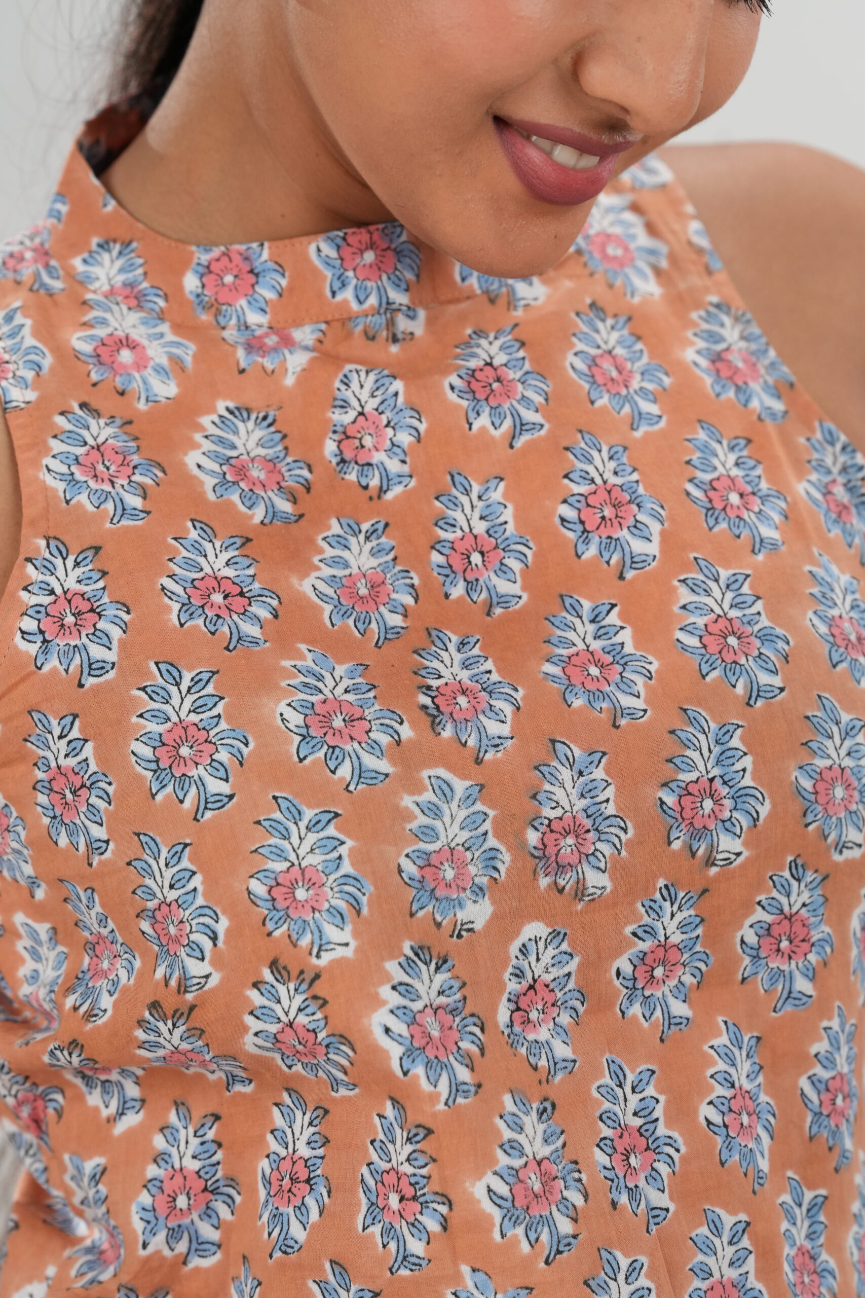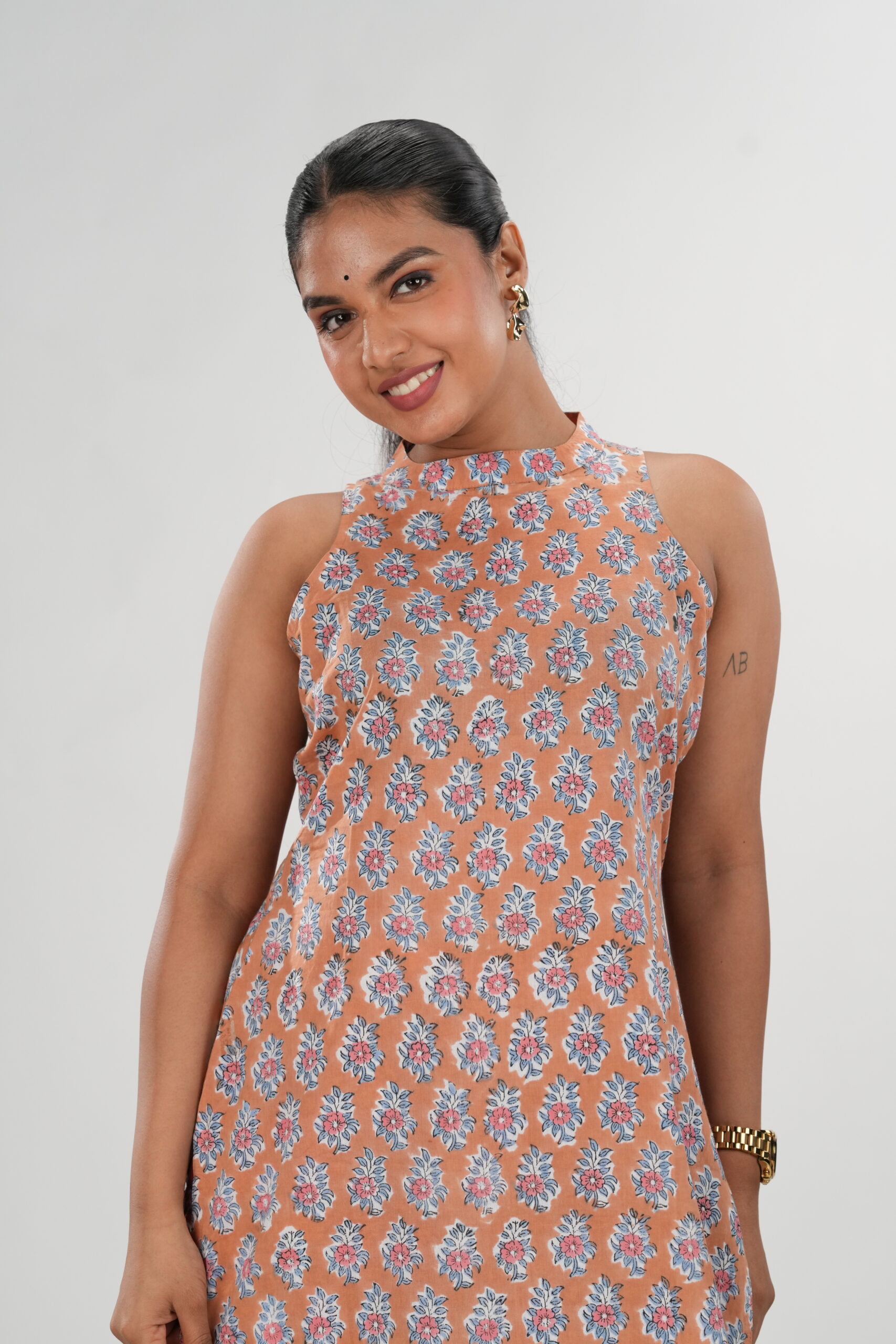 Crafted in cotton, this sleeveless coord features a high-neck halter style kurta adorned with delicate Sanganeri floral handblock prints in warm coral and blue tones. Paired with contrast pants, the ensemble exudes a confident, breezy elegance that transitions seamlessly from day to evening.