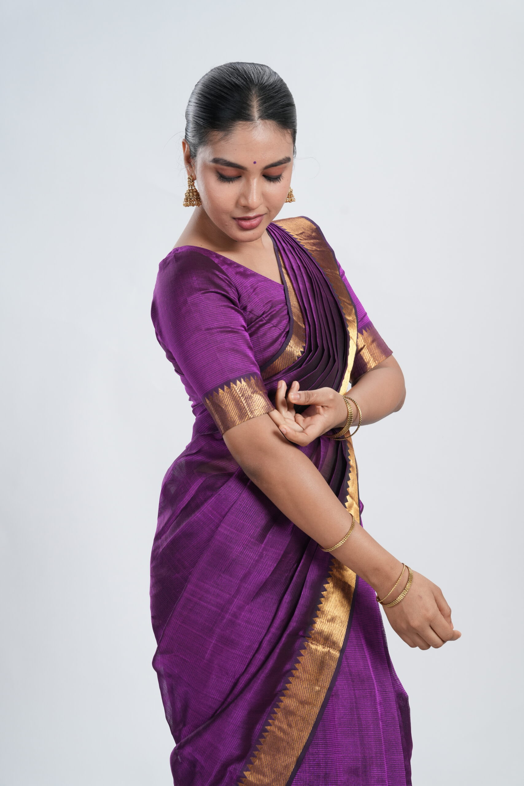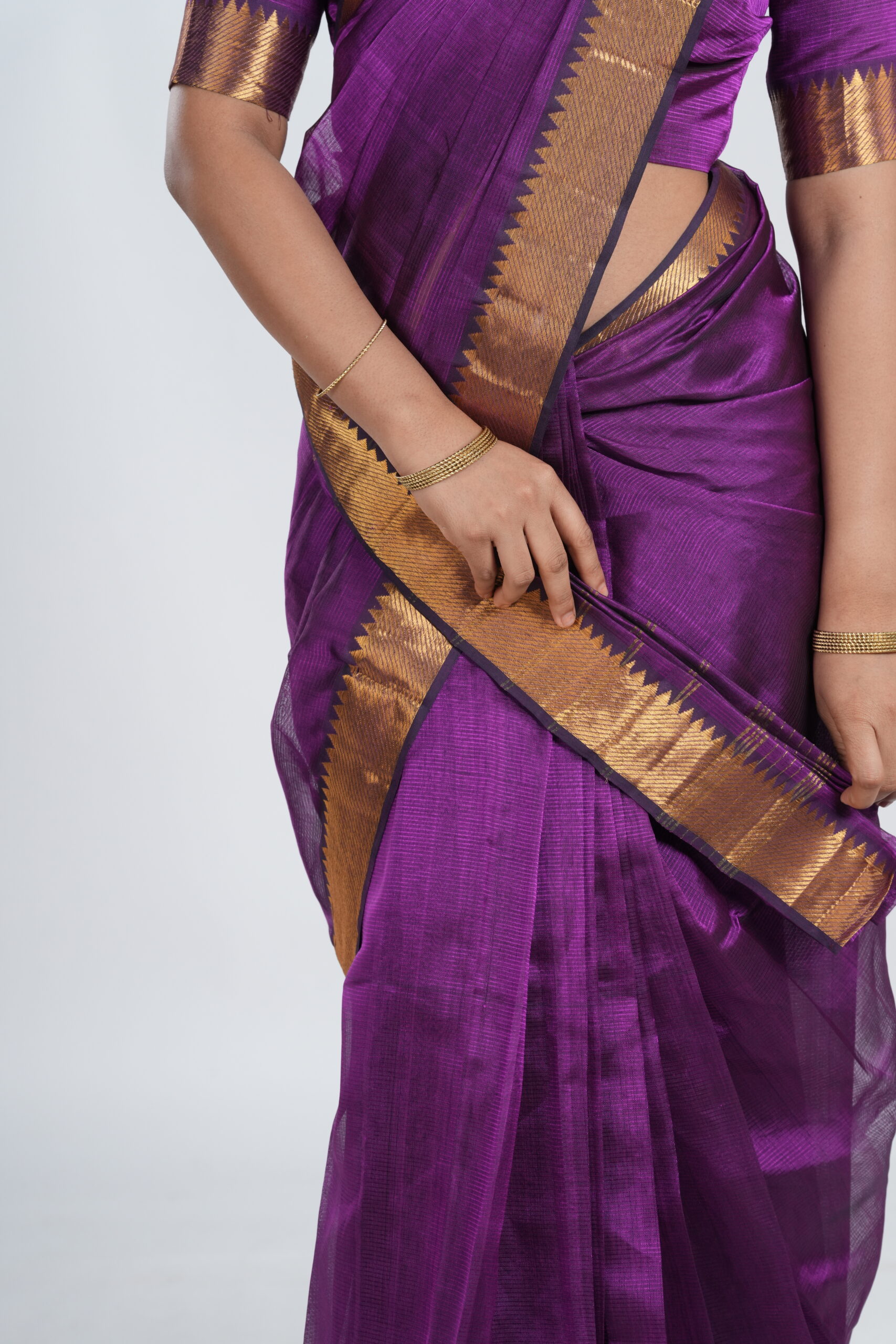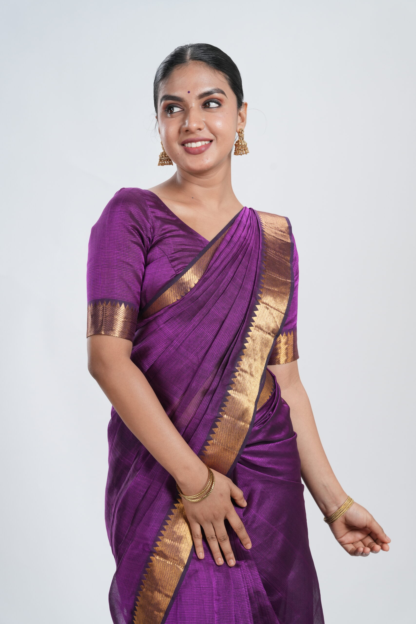 Grace meets tradition in this exquisites Mangalgiri Silk Saree, woven in a serene Rich Royal Purple tone accentuated by a lustrous copper zari border. handwoven in the looms of Mangalgiri, the saree features the region’s signature fine weave with a subtle sheen, with the elegance of silk. The golden-copper zari border and pallu add a timeless touch makeing it perfect for festive wear, temple visit ,or elegant celebration.