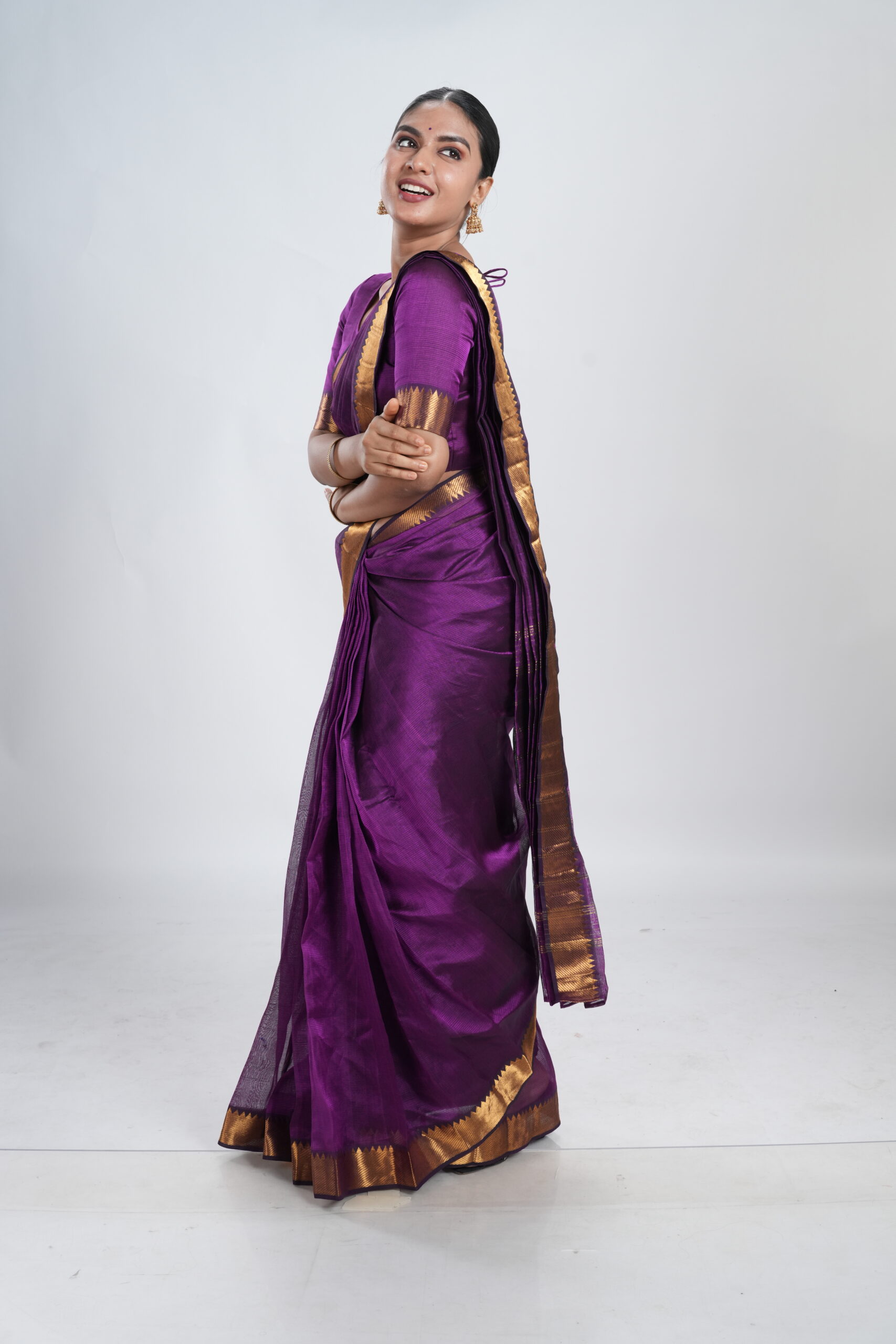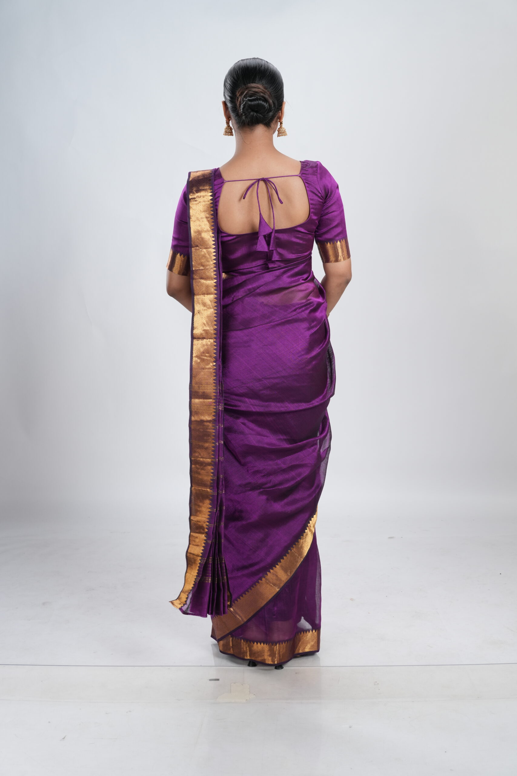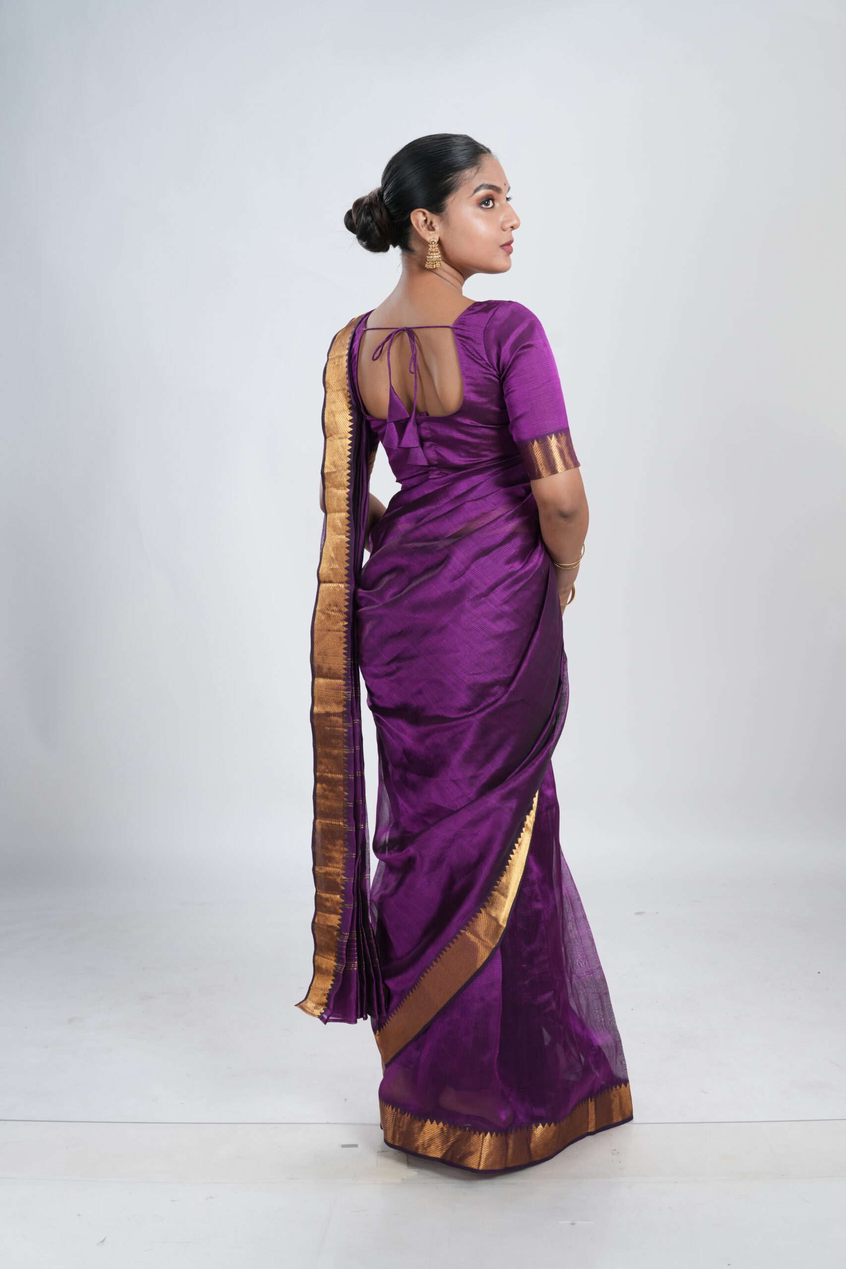 Grace meets tradition in this exquisites Mangalgiri Silk Saree, woven in a serene Rich Royal Purple tone accentuated by a lustrous copper zari border. handwoven in the looms of Mangalgiri, the saree features the region’s signature fine weave with a subtle sheen, with the elegance of silk. The golden-copper zari border and pallu add a timeless touch makeing it perfect for festive wear, temple visit ,or elegant celebration.