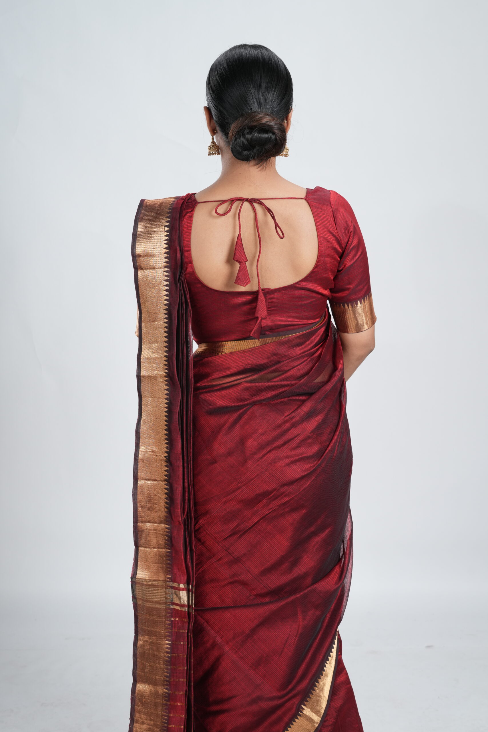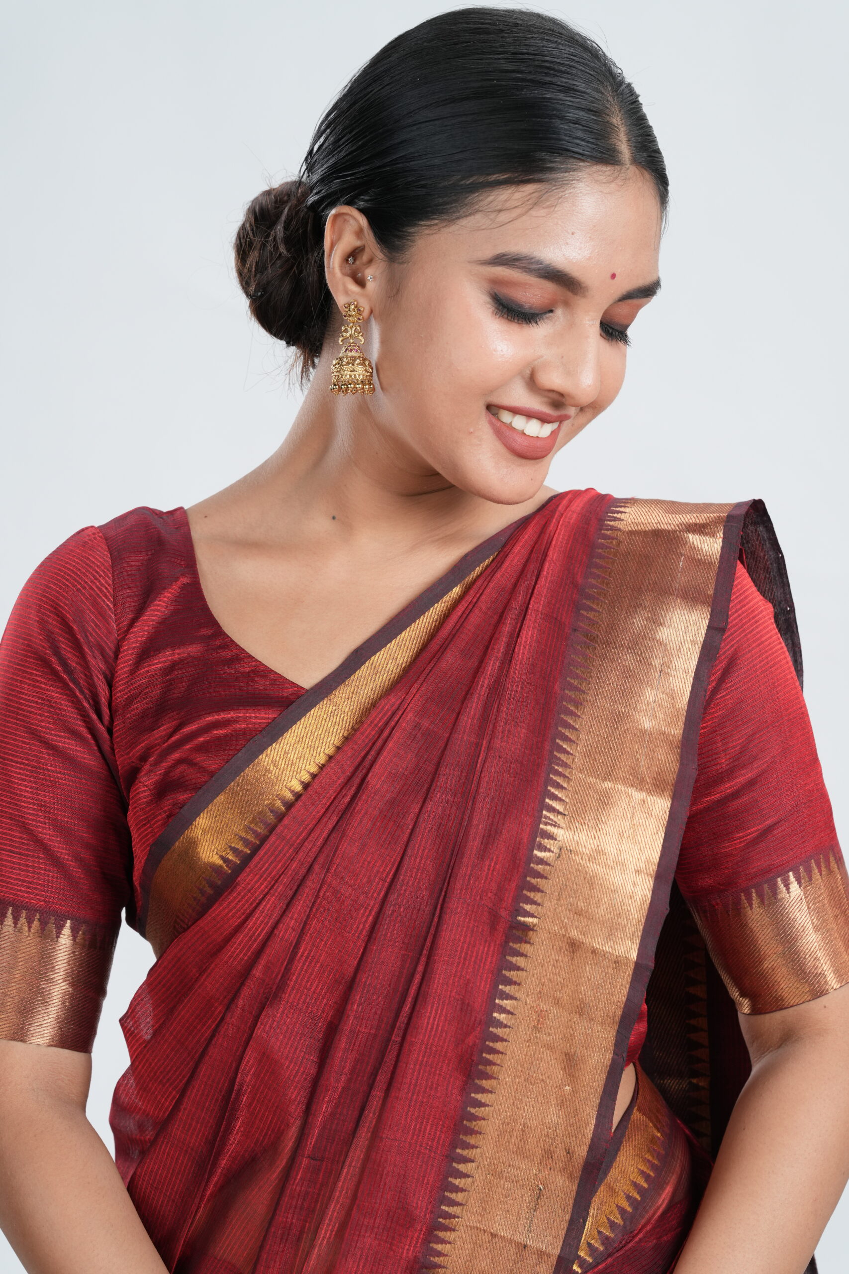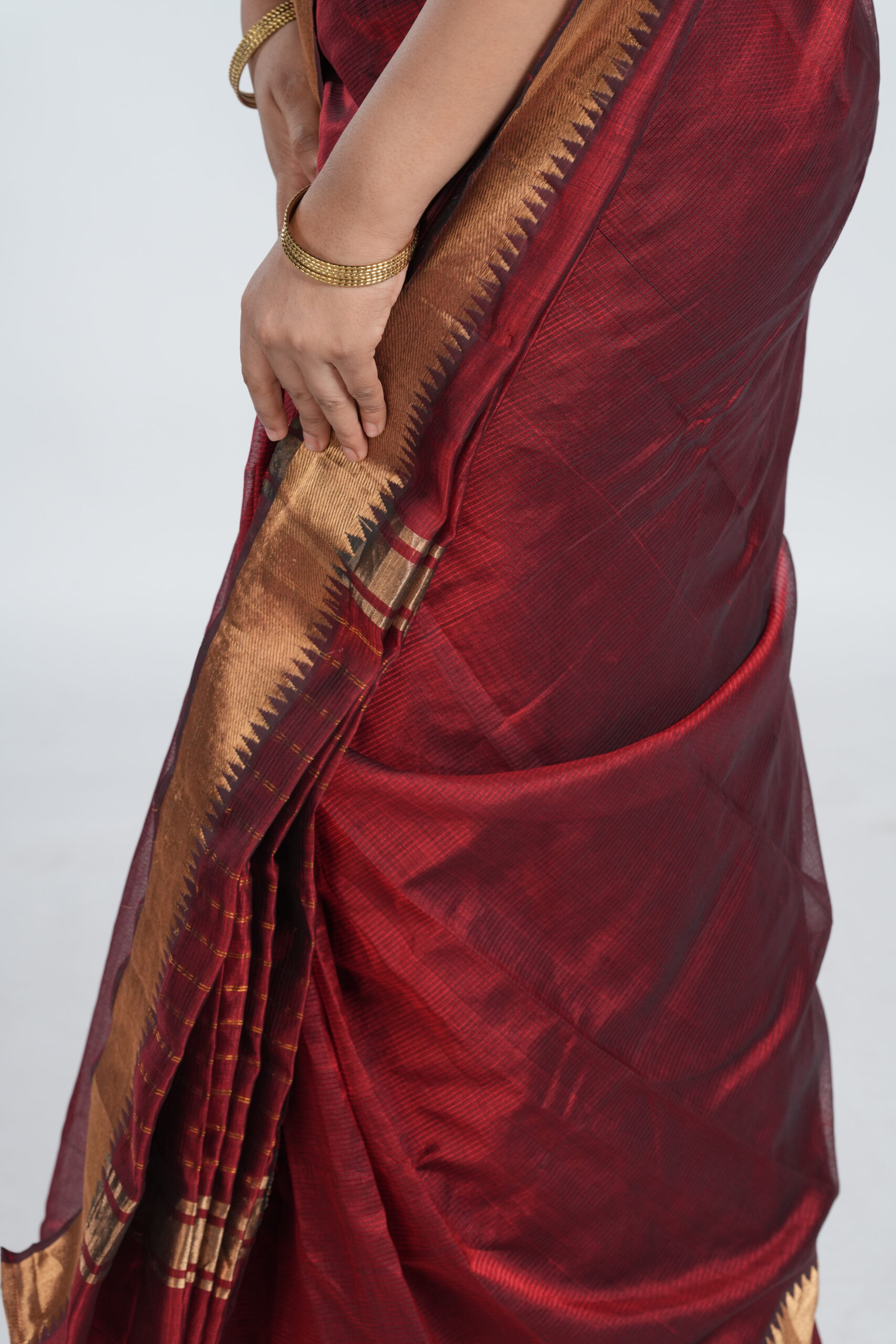 Grace meets tradition in this exquisites Mangalgiri Silk Saree, woven in a serene Maroon Red tone accentuated by a lustrous copper zari border. handwoven in the looms of Mangalgiri, the saree features the region’s signature fine weave with a subtle sheen, with the elegance of silk. The golden-copper zari border and pallu add a timeless touch makeing it perfect for festive wear, temple visit ,or elegant celebration.