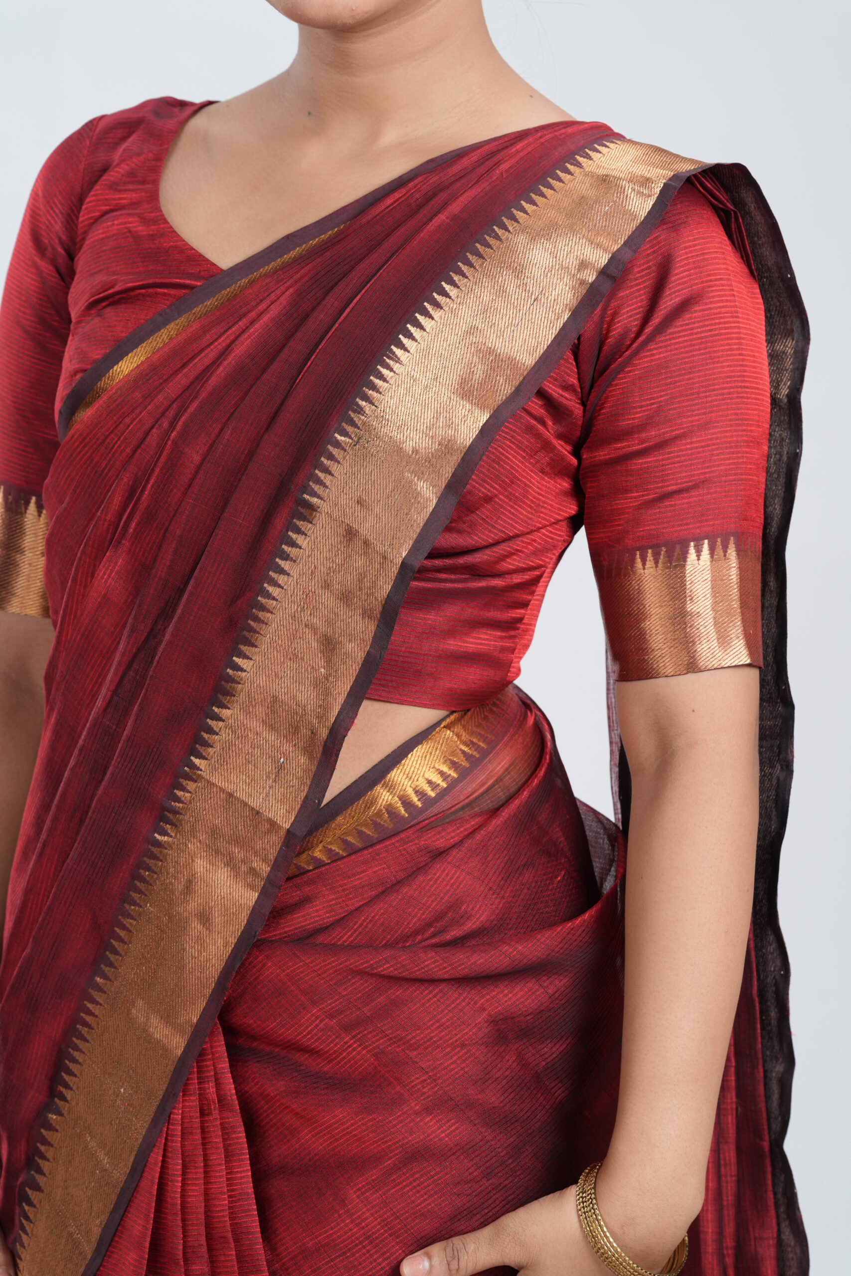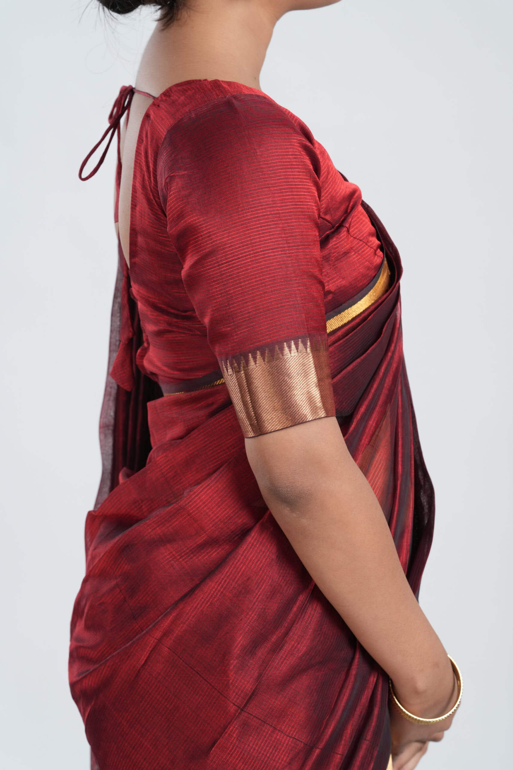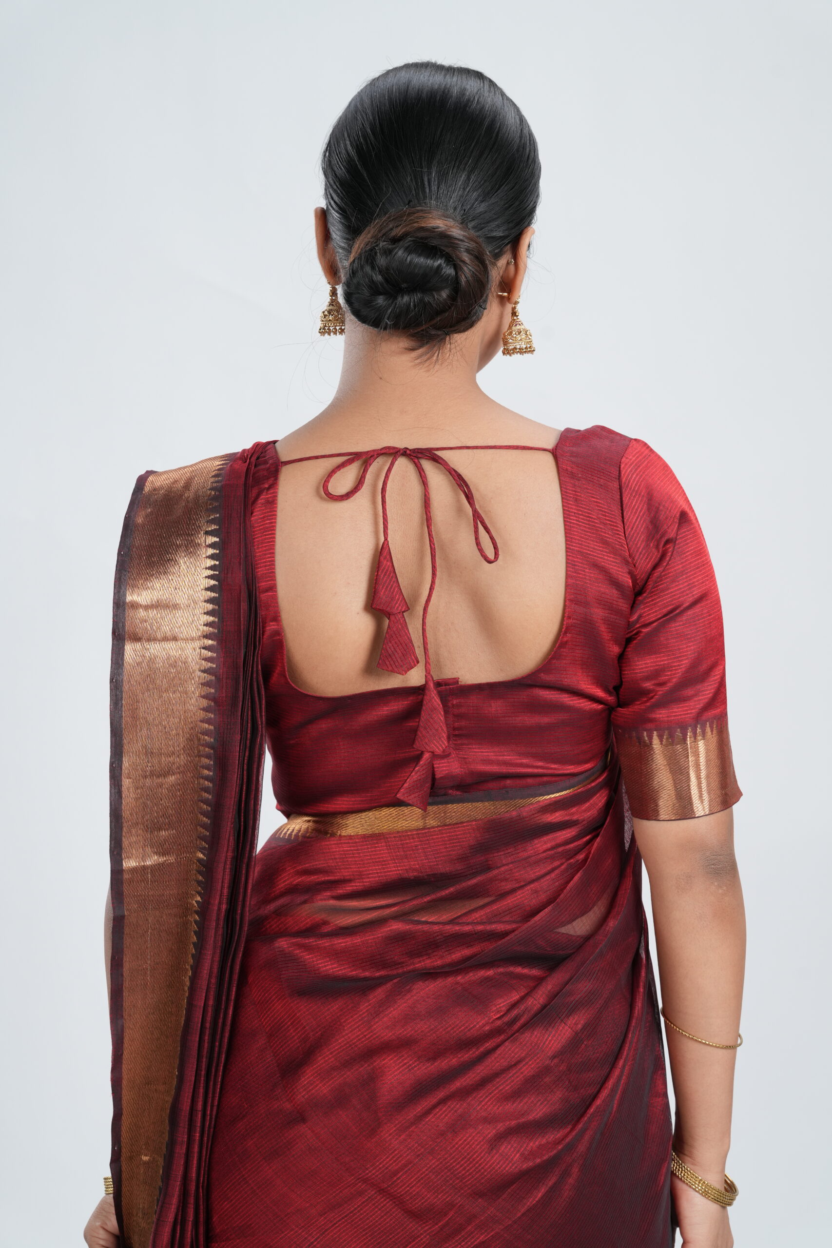 Grace meets tradition in this exquisites Mangalgiri Silk Saree, woven in a serene Maroon Red tone accentuated by a lustrous copper zari border. handwoven in the looms of Mangalgiri, the saree features the region’s signature fine weave with a subtle sheen, with the elegance of silk. The golden-copper zari border and pallu add a timeless touch makeing it perfect for festive wear, temple visit ,or elegant celebration.
