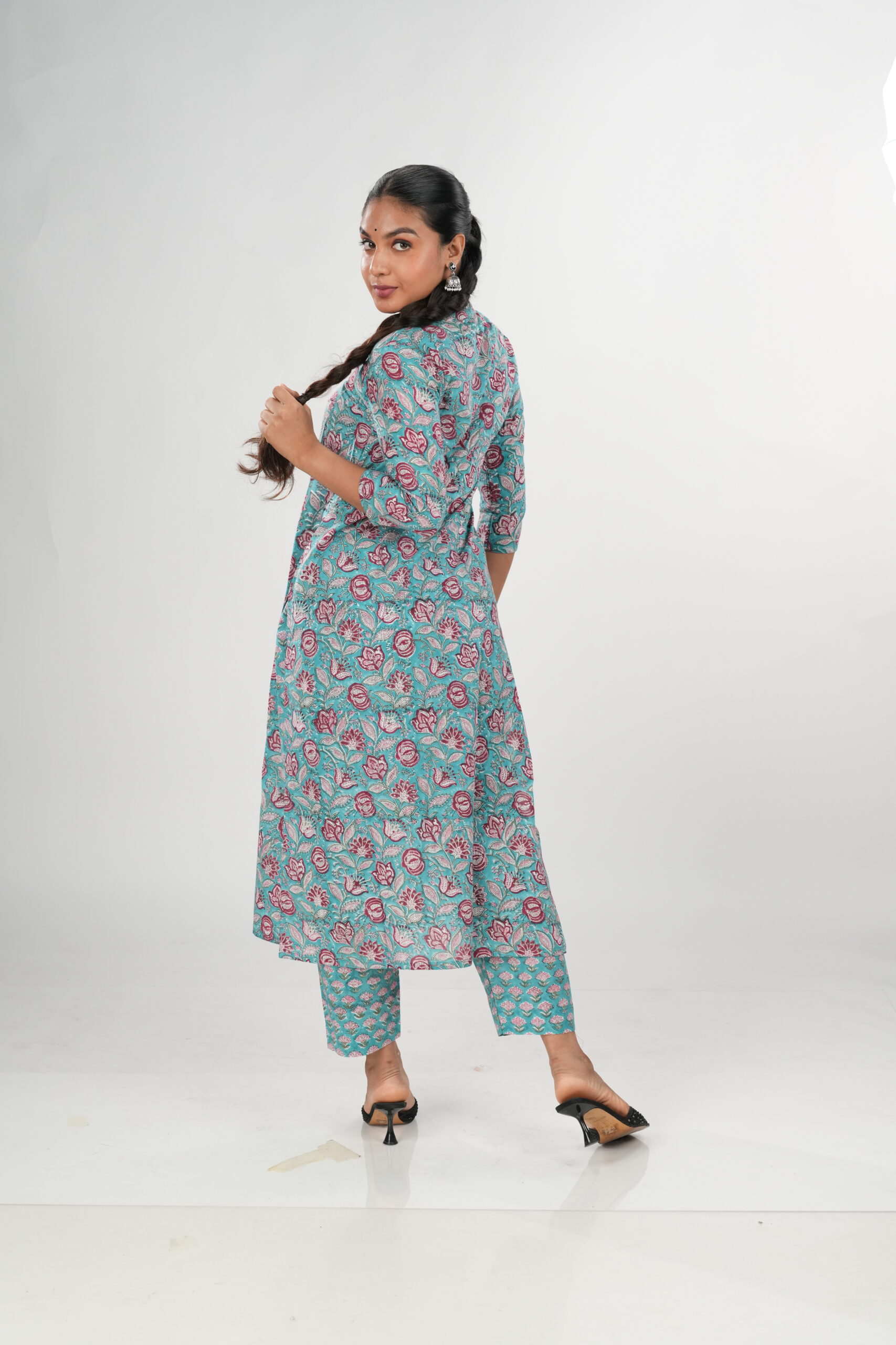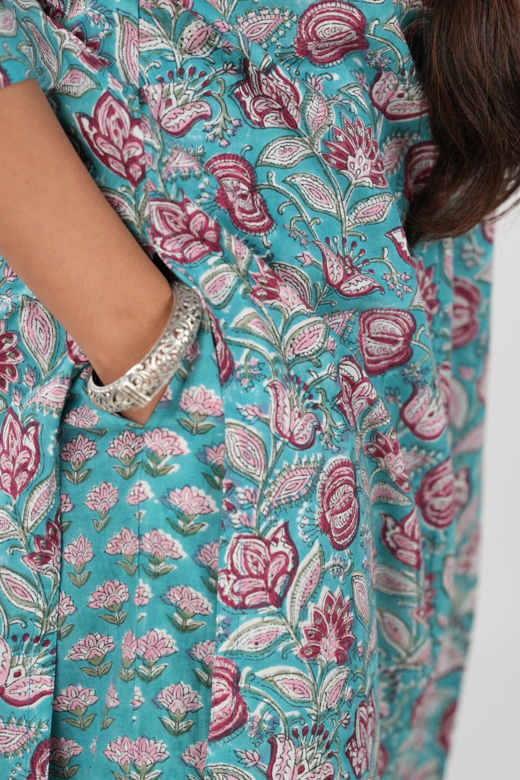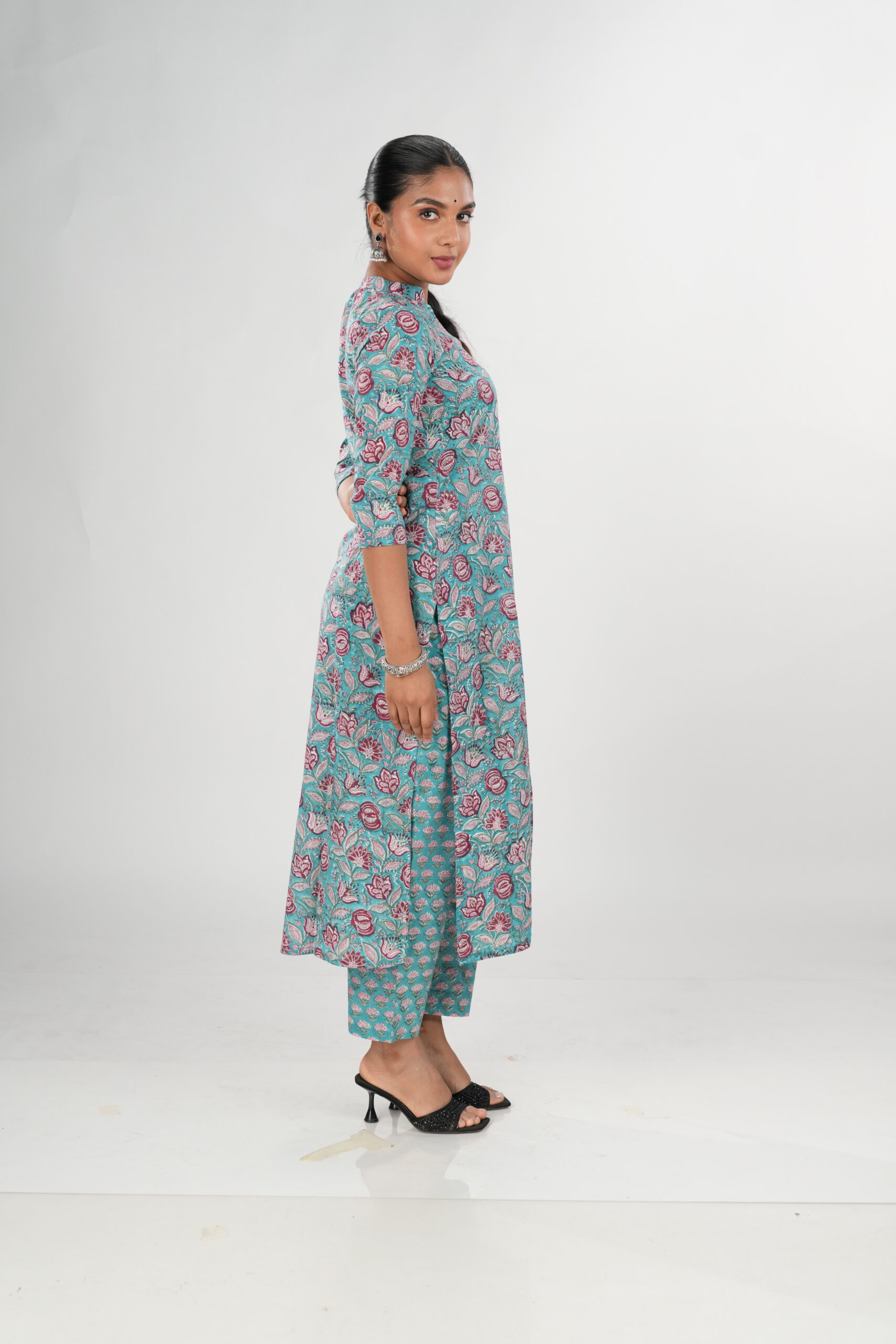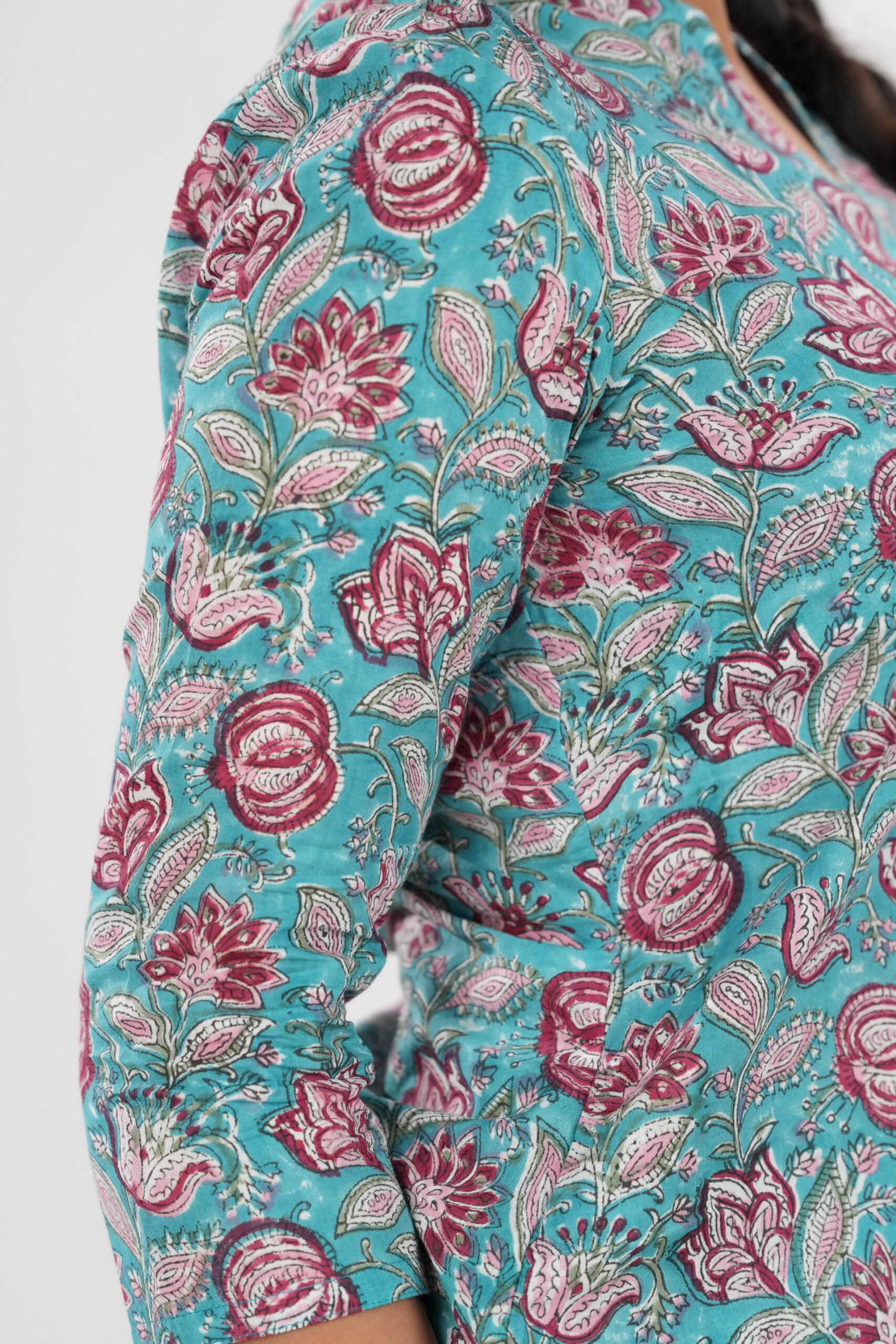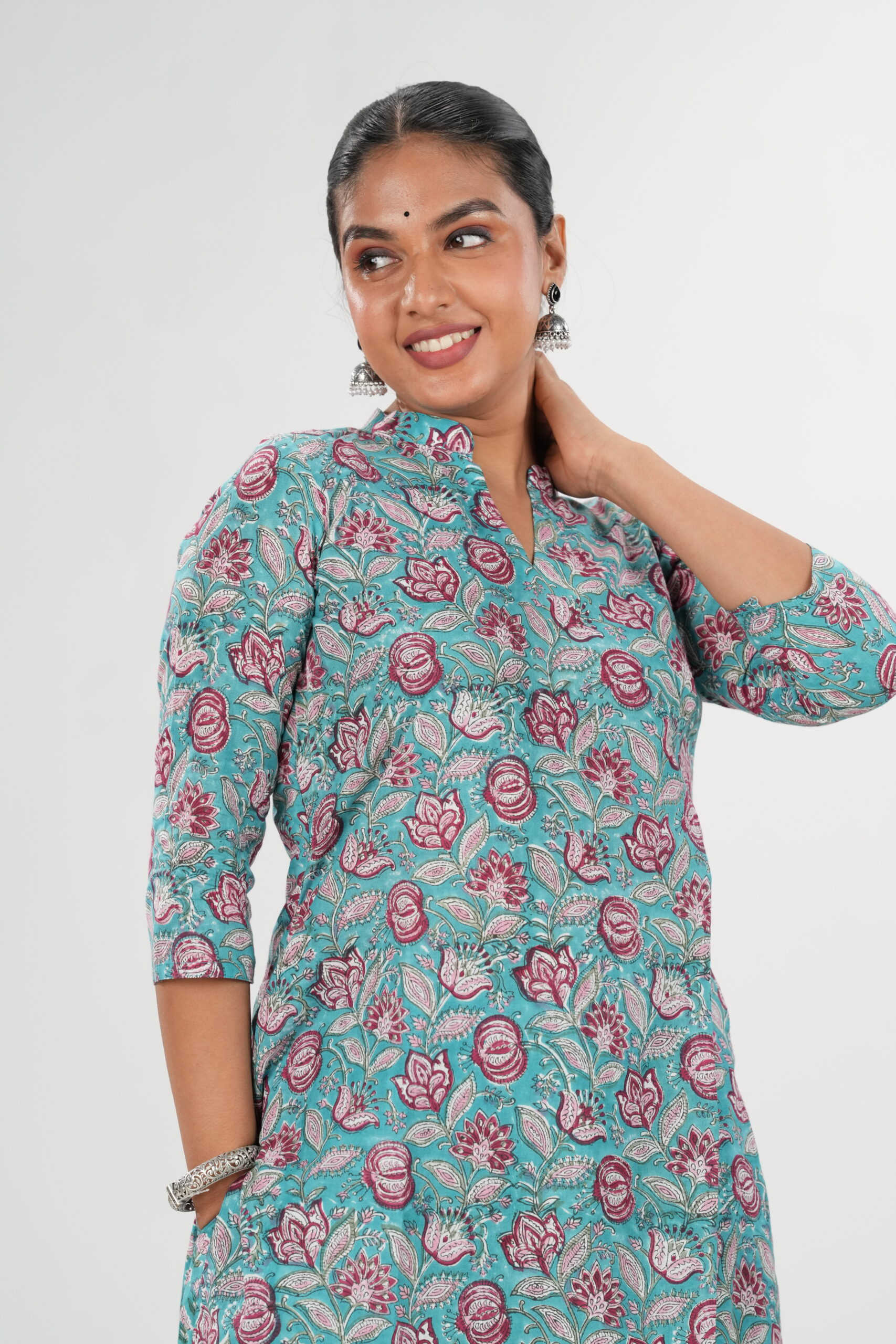 Add a refreshing touch of tradition to your everyday style with the Nayara Sanganeri Co-Ord Set . Crafted from soft, breathable cotton, this set showcases intricate Sanganeri hand block prints in soothing shades of blue and white. The design features a collared neckline with a V-cut detail, three-quarter sleeves, and coordinated printed pants that ensure both comfort and sophistication.