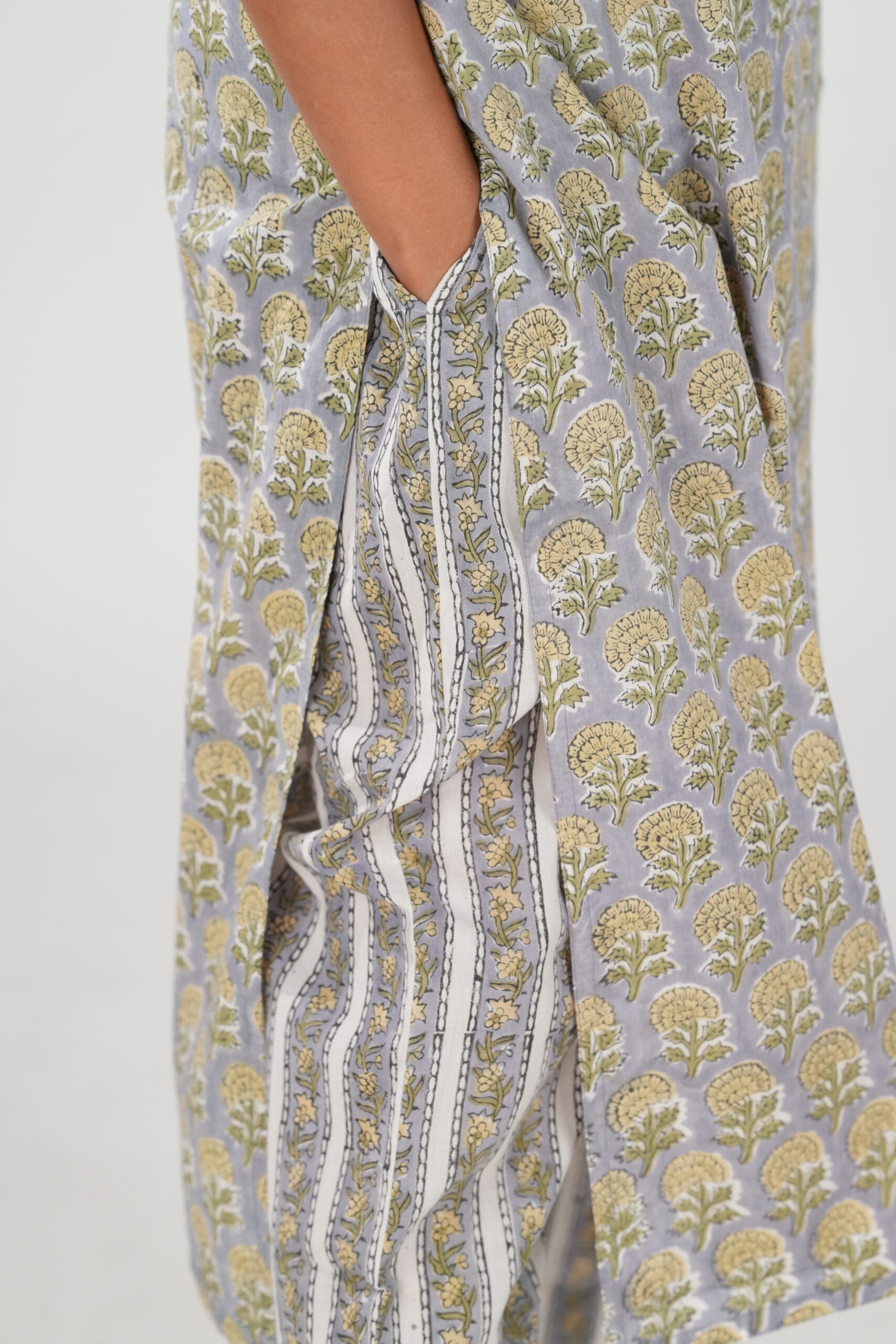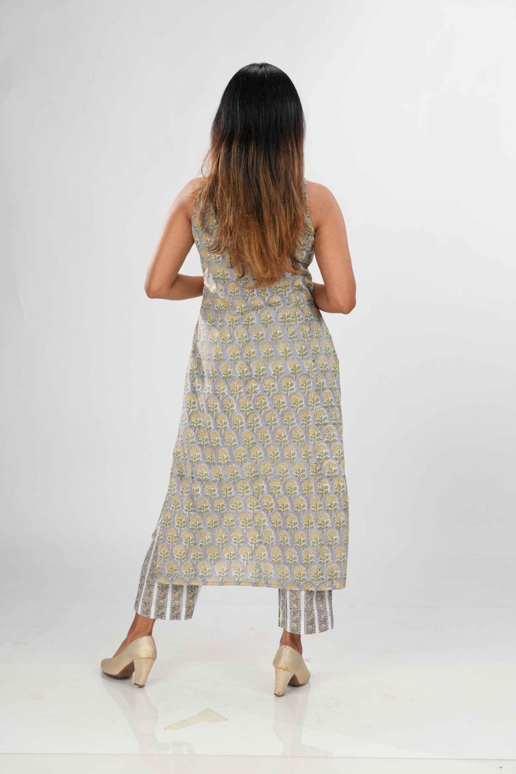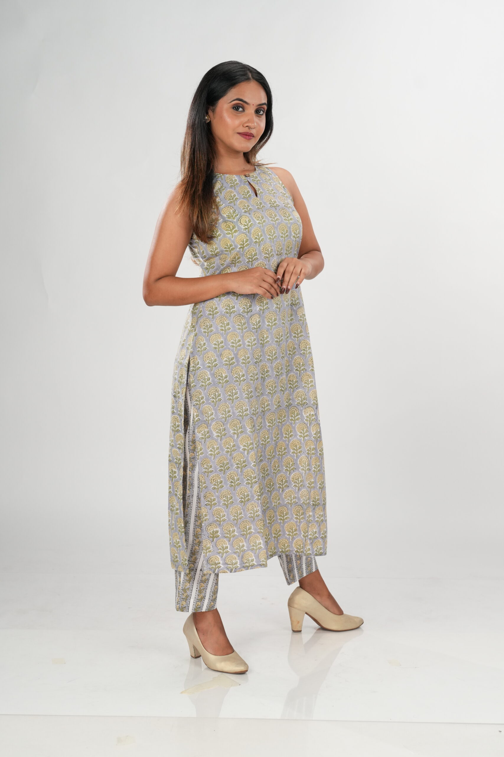 Handcrafted in cotton, this sleeveless coord features a keyhole neckline and soothing pastel-toned Sanganeri handblock floral prints. The straight-cut kurta pairs beautifully with striped pants, giving the ensemble a balanced mix of tradition and modern ease.