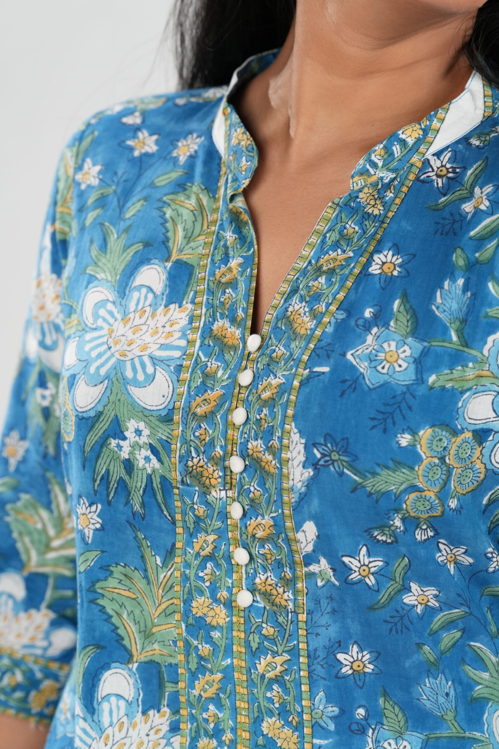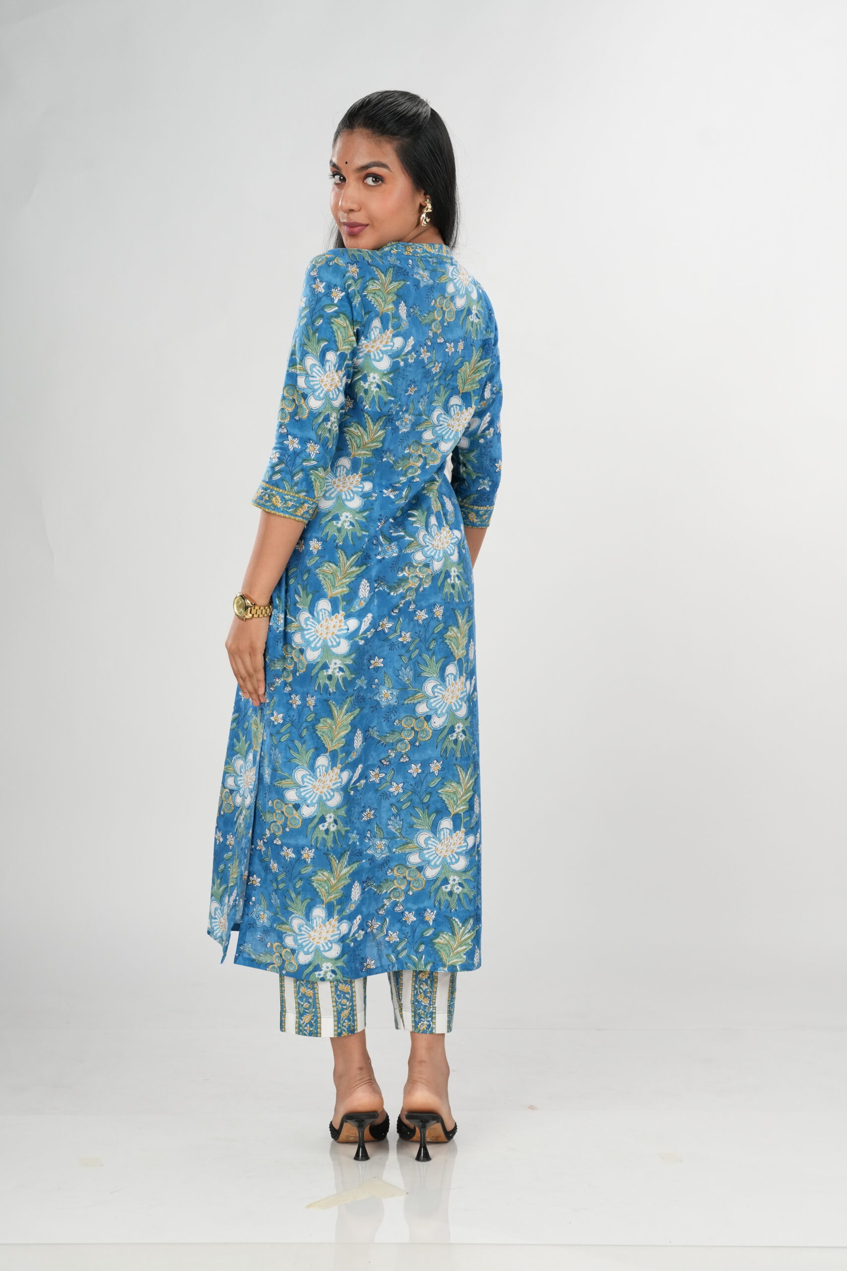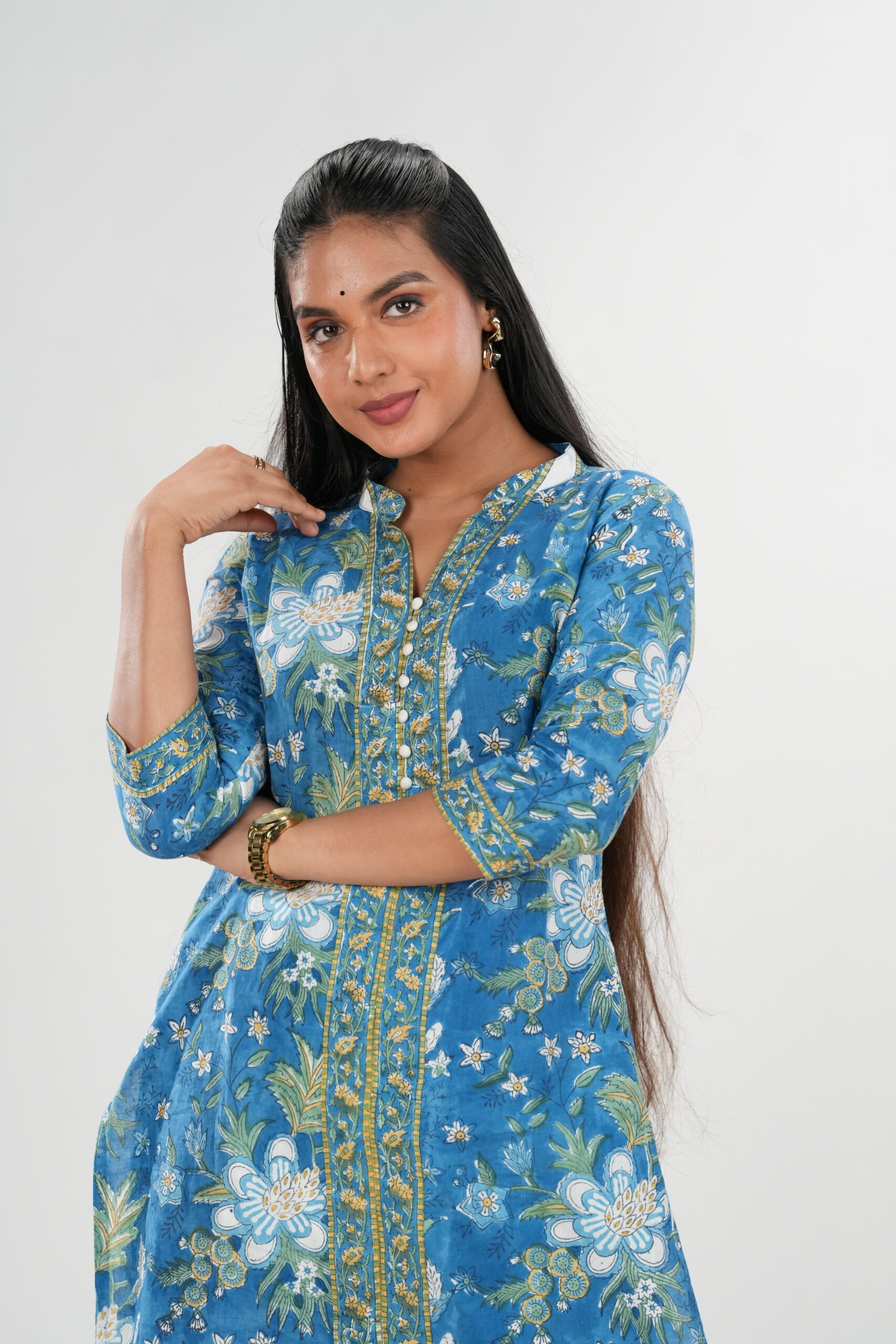 Handcrafted in soft cotton, this sky-blue coord features traditional Sanganeri block prints inspired by the floral gardens of Rajasthan. The kurta is detailed with a contrast printed border and subtle tassel accents, paired with matching straight pants for a coordinated yet easy silhouette.