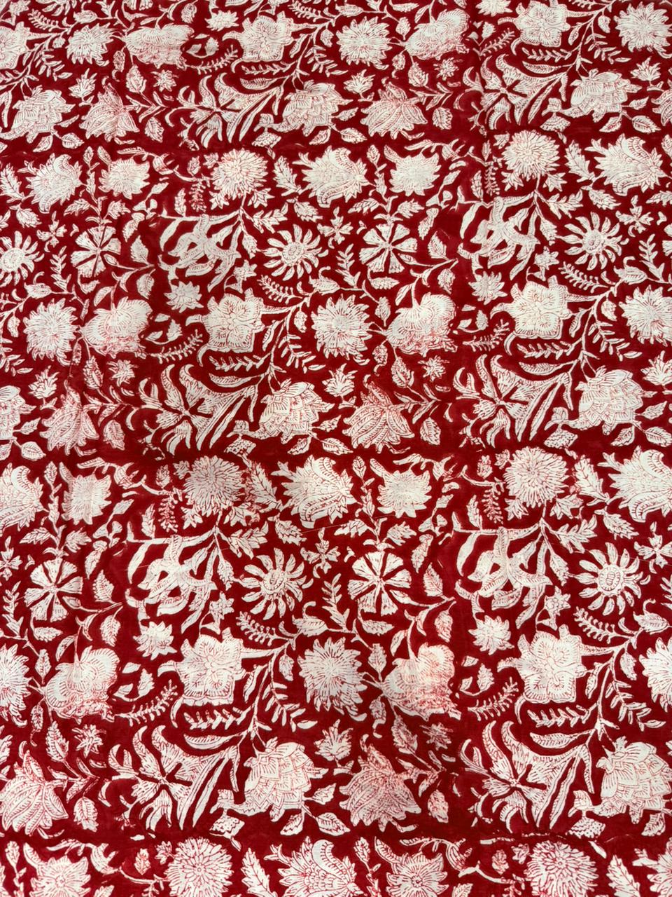 Sanganeri cotton handblock fabric is a hand-printed cotton textile from Rajasthan, India, known for its soft feel and intricate designs, often featuring delicate floral and natural motifs on white or off-white backgrounds. The process involves using hand-carved wooden blocks to stamp designs with vibrant colors, and the fabric is versatile for both clothing and home decor.