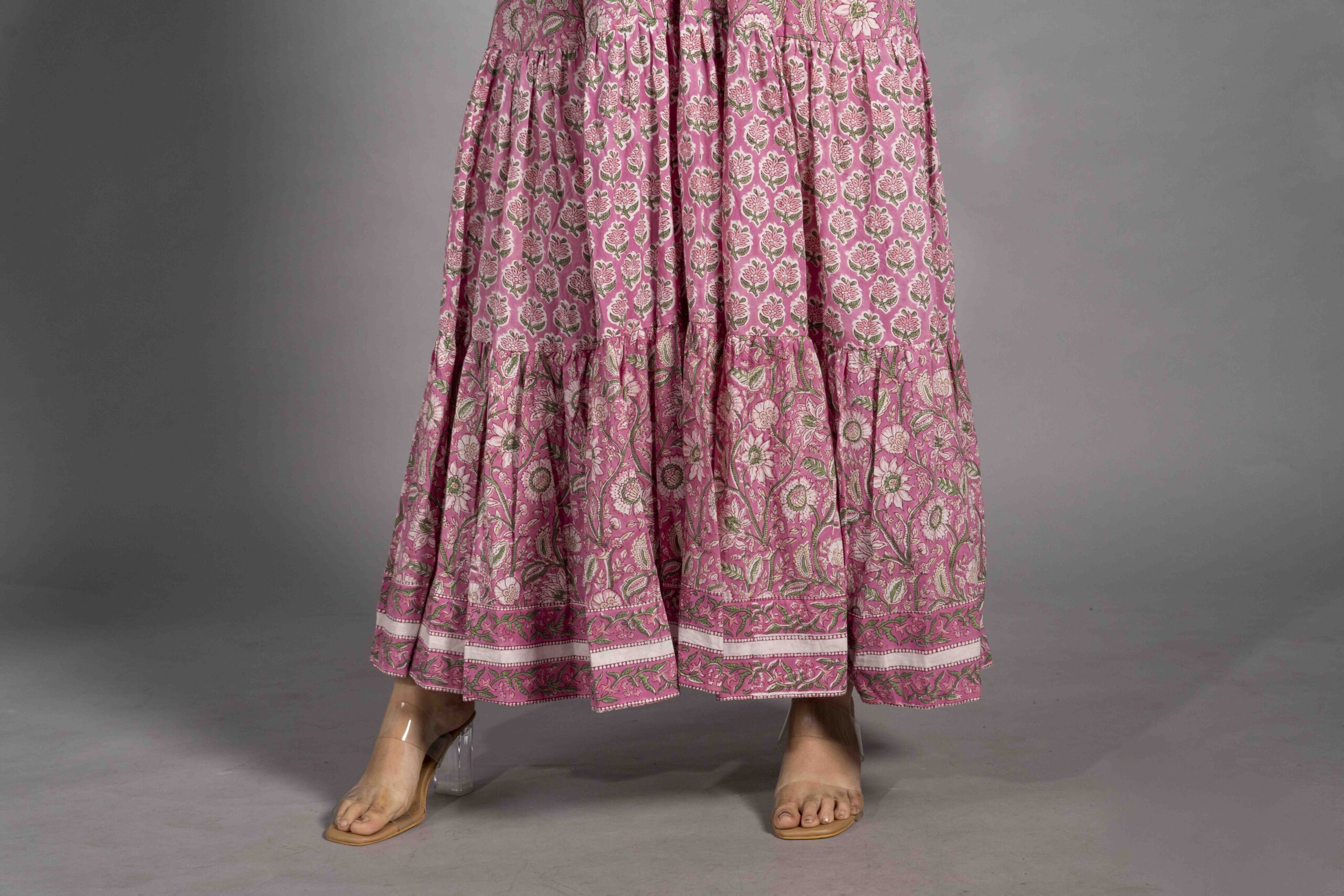 Effortlessly elegant and perfect for warm days, this Sanganeri cotton tiered dress brings together comfort and timeless craft. Made using traditional Sanganeri handblock prints, the fabric features delicate floral motifs in soothing hues, set against a vibrant base that reflects the charm of Rajasthan’s heritage textiles.
